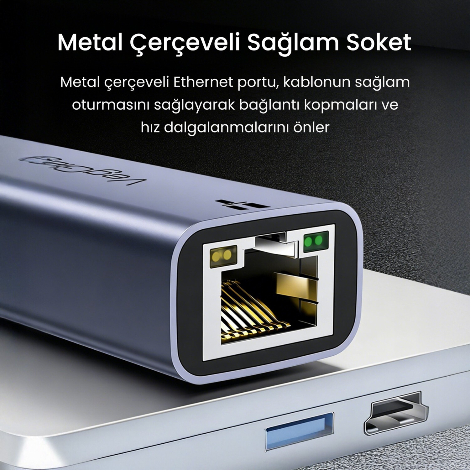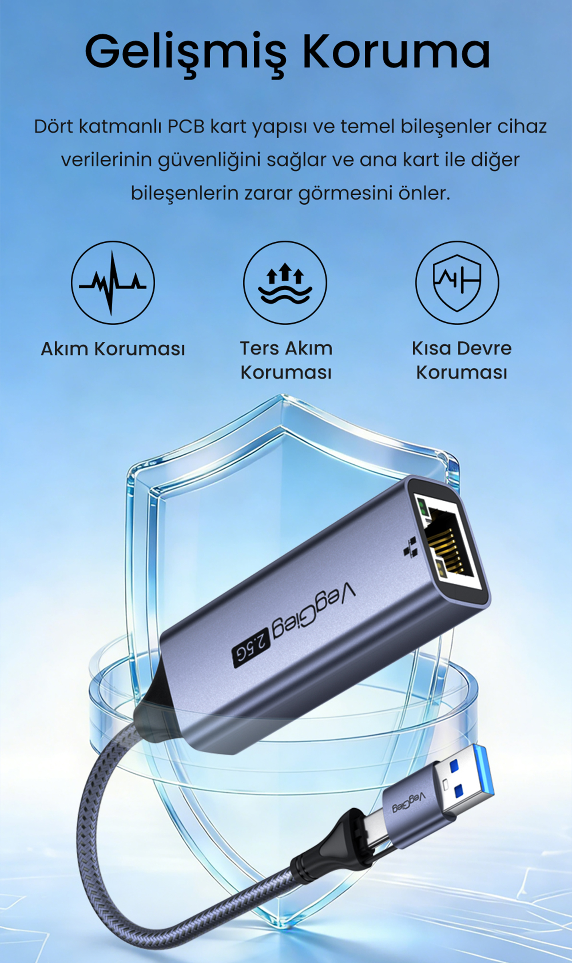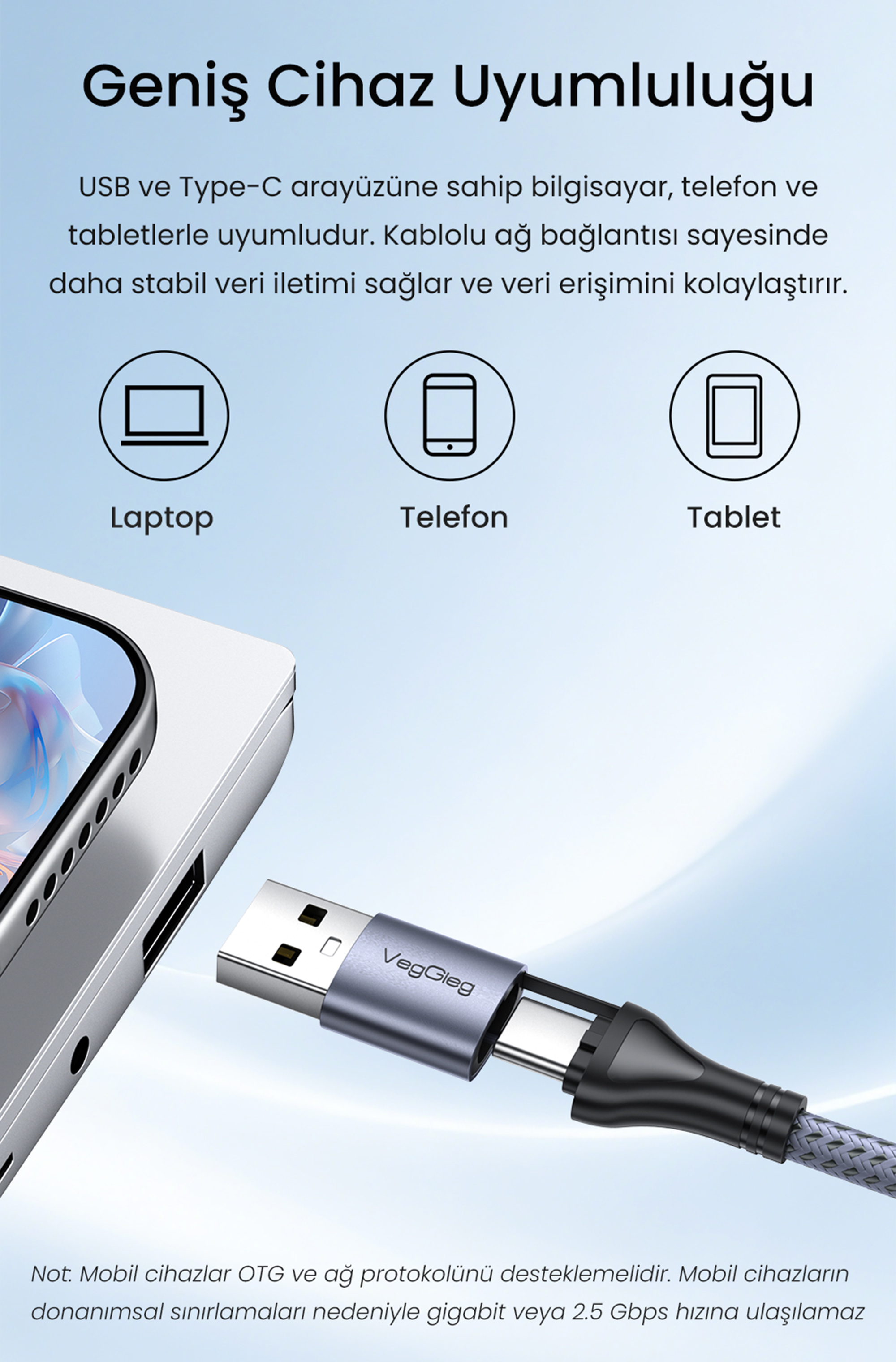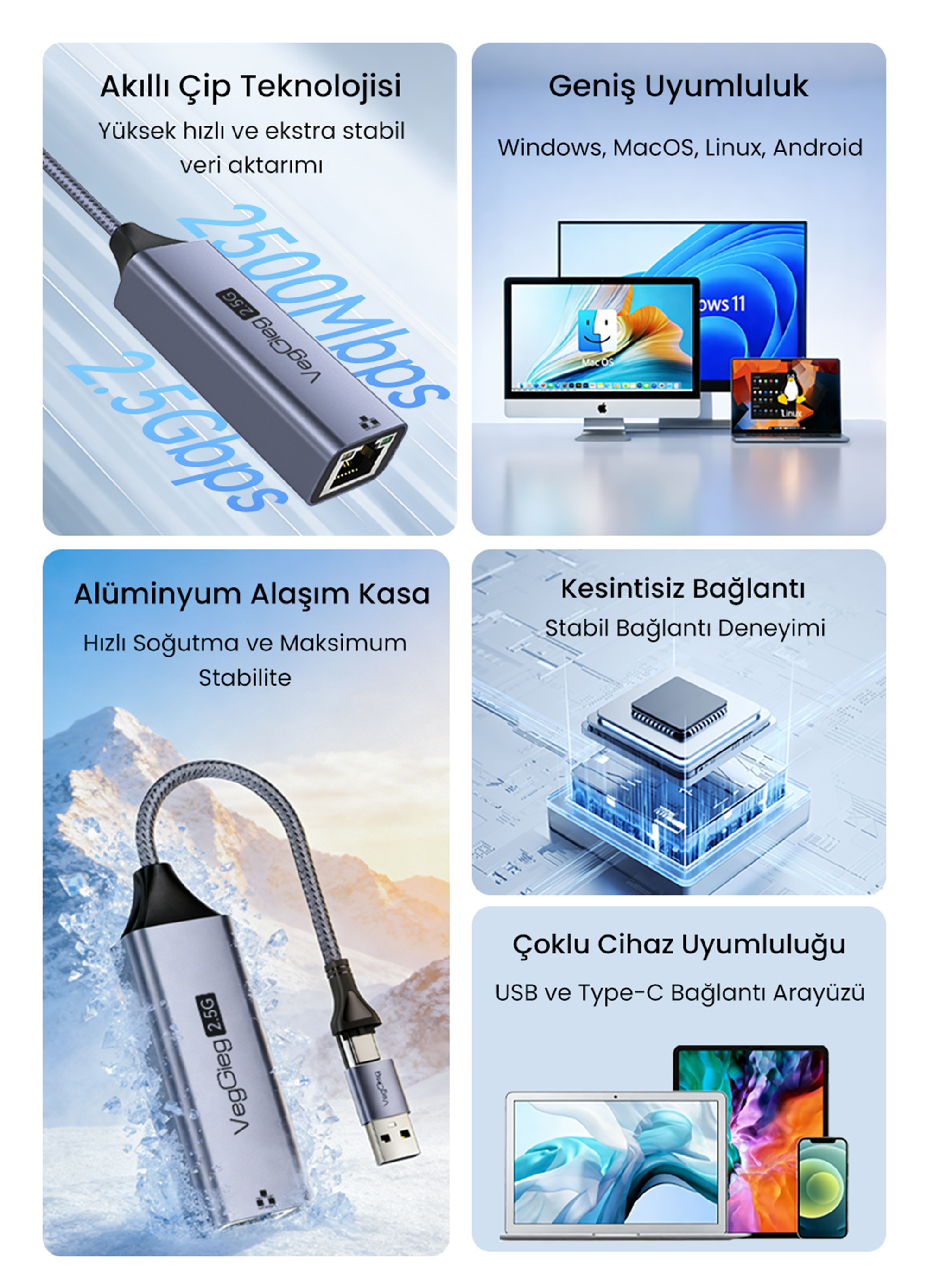 VegGieg V-K313 USB-A ve Type-C 2.5G Gigabit Ethernet Dönüştürücü Adaptör, standart Gigabit (1000Mbps) ağ bağlantılarının sınırlarını aşarak size tam iki buçuk kat daha yüksek, yani 2500Mbps (2.5G) ultra veri aktarım hızı sunan yeni nesil bir ağ donanımdır. Bu ürünü rakiplerinden ayıran en büyük özelliği, kablo ucunda yer alan ikisi bir arada (2 in 1) konnektör yapısıdır; bu sayede adaptörü ister klasik USB-A portuyla eski nesil bilgisayarlarınızda, isterseniz de Type-C ucuyla yeni nesil MacBook, ultrabook veya tabletlerinizde kullanabilirsiniz. Yüksek hızın getirdiği ısınma sorununu ortadan kaldıran premium alüminyum alaşım gövdesi ve kopmalara karşı dayanıklı örgülü kablosu ile hem şık hem de uzun ömürlü bir performans sunar. Ekstra yazılım gerektirmeyen Tak-Çalıştır (Plug and Play) özelliğiyle, profesyonel e-spor oyuncuları, içerik üreticileri ve büyük veri transferi yapan ofisler için kesintisiz, gecikmesiz ve güvenilir bir kablolu ağ deneyimi sağlar.