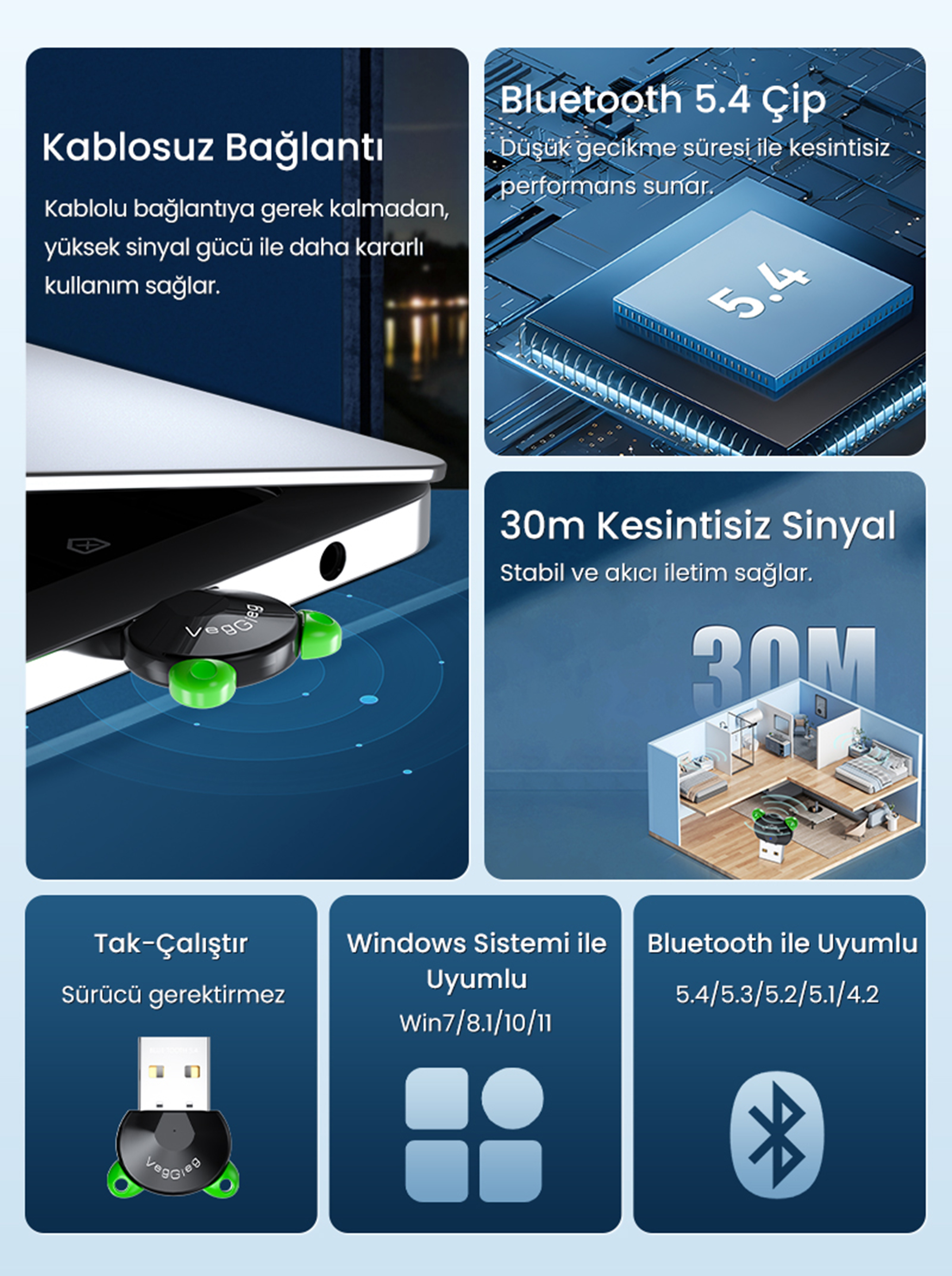 En güncel Bluetooth 5.4 versiyonu ile donatılan VegGieg V-UB504, önceki nesillere göre çok daha hızlı veri aktarımı, mükemmel enerji verimliliği ve stabil bir bağlantı sunar. Akıllı çipi sayesinde Bluetooth 5.4 ve altındaki tüm eski versiyon cihazlarla otomatik olarak eşleşerek tam geriye dönük uyumluluk sağlar.