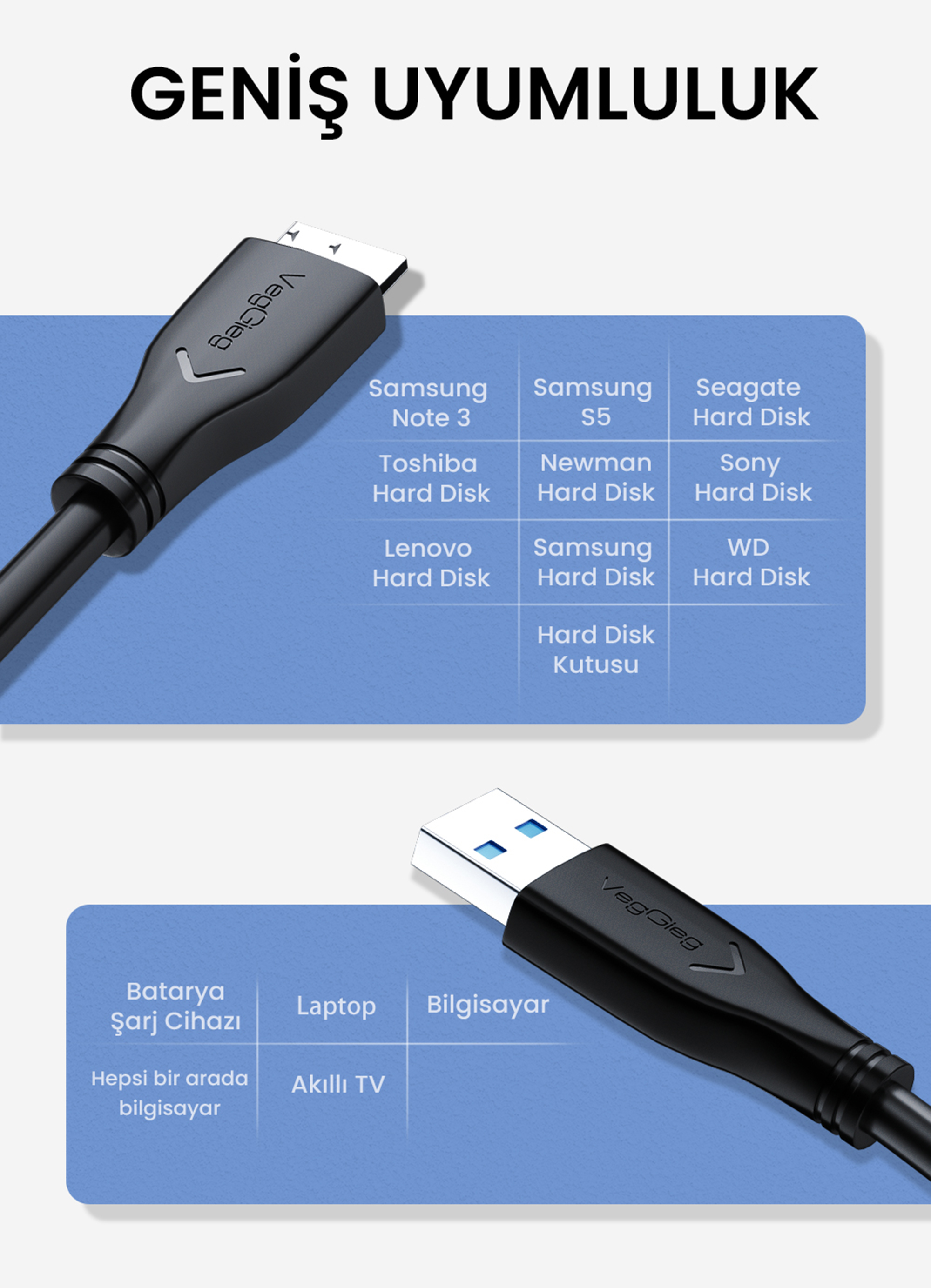 VegGieg USB 3.0 to Micro B kablo; harici hard disk sürücüleri, bazı eski model Samsung telefonlar ve Micro B portuna sahip diğer cihazlarla tam uyumludur. Özellikle veri yedekleme ya da dosya transferi gereken durumlarda vazgeçilmez bir yardımcıdır.