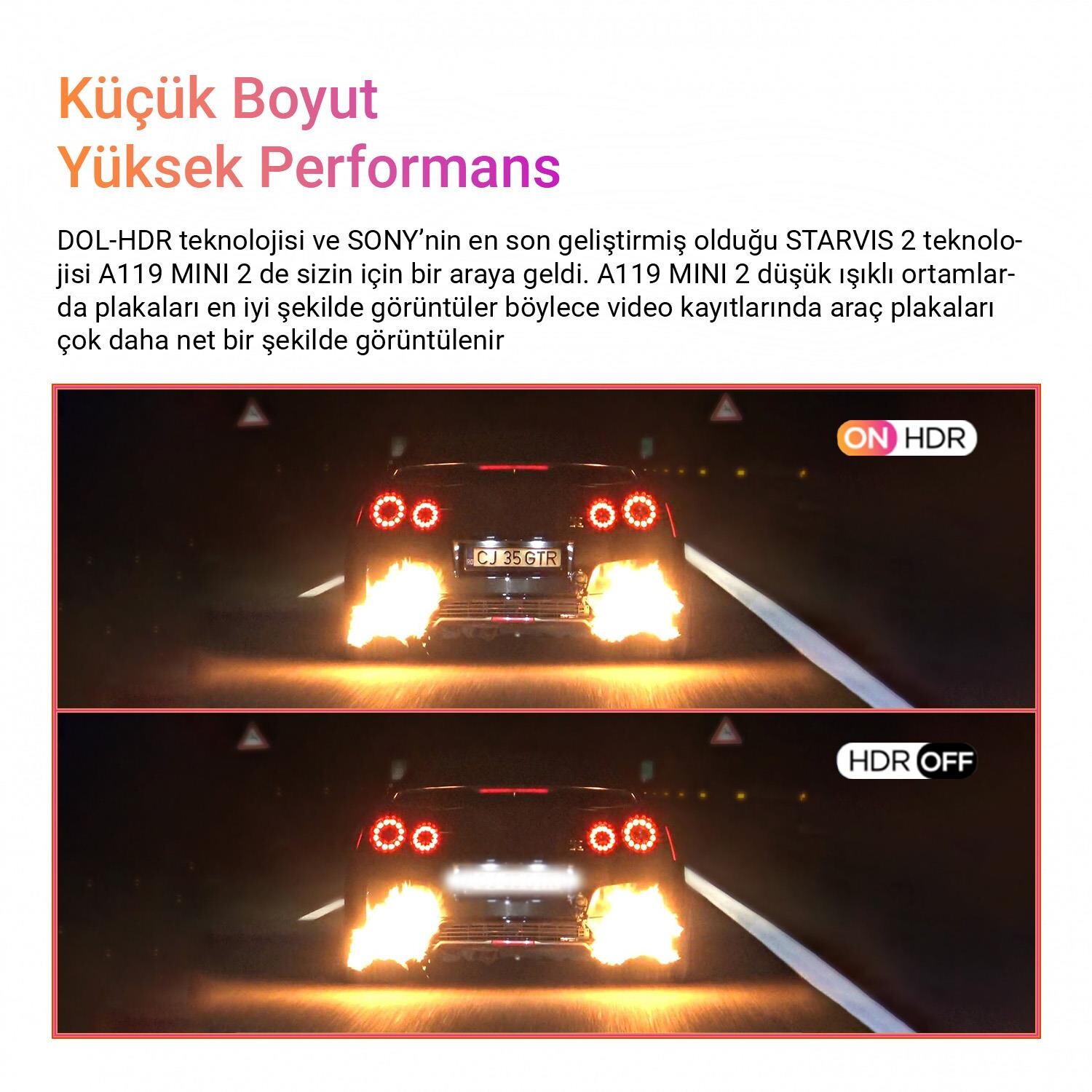 Viofo A119 Mini 2 2K HDR 1600P 5GHz WiFi GPS'li Araç Kamerası, sürüş güvenliğinizi arttırmak için en üst teknoloji ile donatılmıştır. İçerisinde bulunan Sony STARVIS 2 IMX675 sensörü 140° lensle birlikte görüntüleri en net şekilde kaydeder. DOL-HDR teknolojisi sayesinde ışıklandırmalar otomatik olarak yapılır böylece kaydedilen videolarda detaylar kaybolmaz araç plakaları gündüz veya gece en iyi şekilde okunur. Dahili Wi-Fi modülü A119 MINI 2 ile bağlantı kurarak mobil uygulama üzerinden kamera ayarlarını yapabilir, canlı olarak izleyebilir veya kaydedilmiş bir videoyu indirebilirsiniz. Sesli geri bildirimi ve küçük boyutu sayesinde odağınızı yoldan ayrılmaz böylece daha güvenli bir sürüş yaşarsınız. Opsiyonel olarak alacağınız park modu kitlerini kullanarak park modlarını kullanabilirsiniz. Hareket algılama, hızlı çekim, düşük bit hızlı kayıt gibi park modlarını kullanarak aracınızın yanında değilken aracınızı güven altına almış olursunuz. Kayıtlarınızı daha kaliteli hale getirmek için opsiyonel olan CPL filtreyi alarak güneş ışığı ve yansıma gibi alınan video kaydının kalitesini düşüren sorunlardan kurtulabilirsiniz. A119 MINI 2 sahip olduğu GPS modülü sayesinde hız, zaman, rota gibi verileri video içine şifreler böylece uygun görüntüleyici kullanılarak kayıtlar izlendiğinde bu verilere ulaşabilirsiniz. Dahili bluetooth modülü ise opsiyonel olarak alacağınız Viofo uzaktan kumanda ile eşleşerek acil durum kayıt tuşunu uzaktan tetikleme imkânı sağlar. Acil durum kayıt özelliği kaza anında otomatik olarak tetiklenerek kaza anını silinmeyecek şekilde kaydeder, bu özelliğin tetiklenmediği kazalarda özelliği manuel olarak kumandanızdan veya kamera üzerinden aktif edebilirsiniz böylece kameraların olmadığı bir alanda güçlü bir kanıtınız olur.