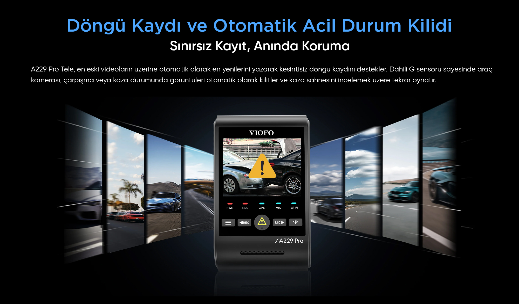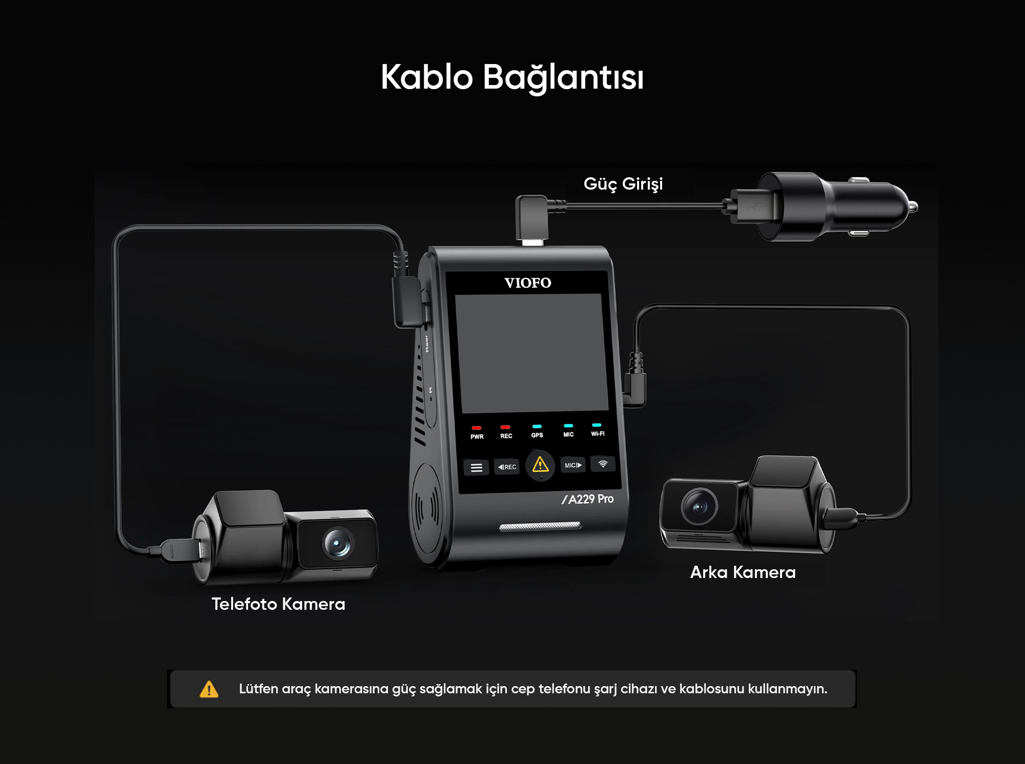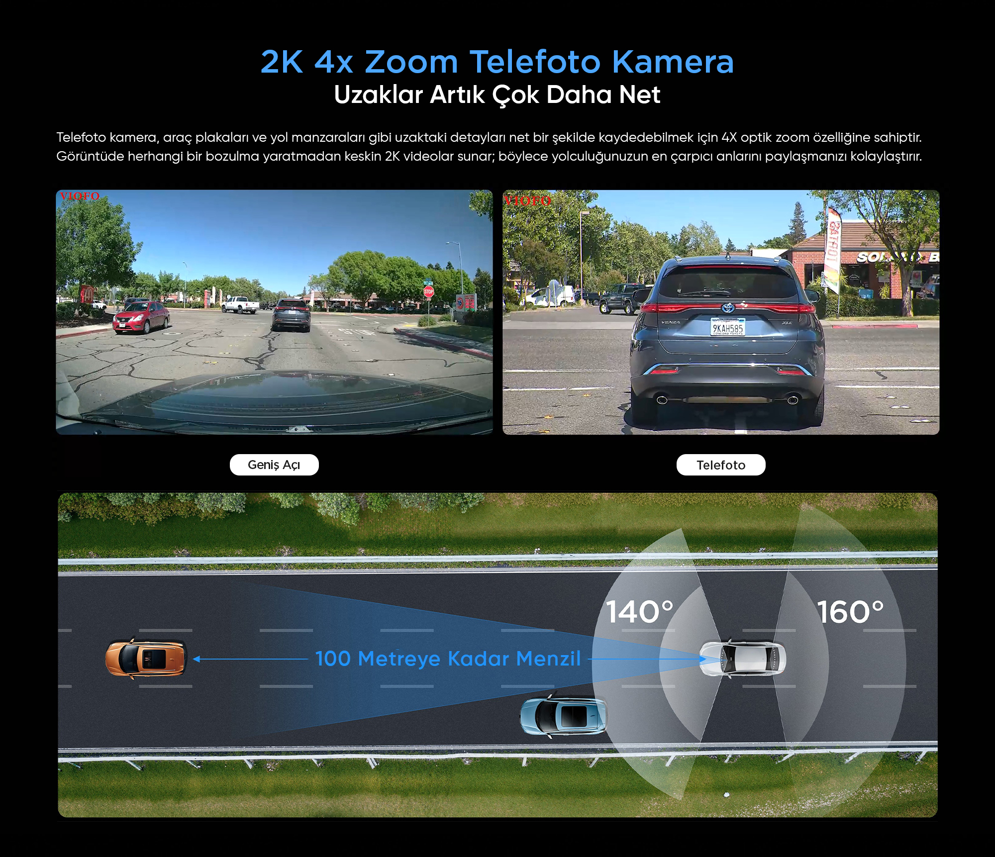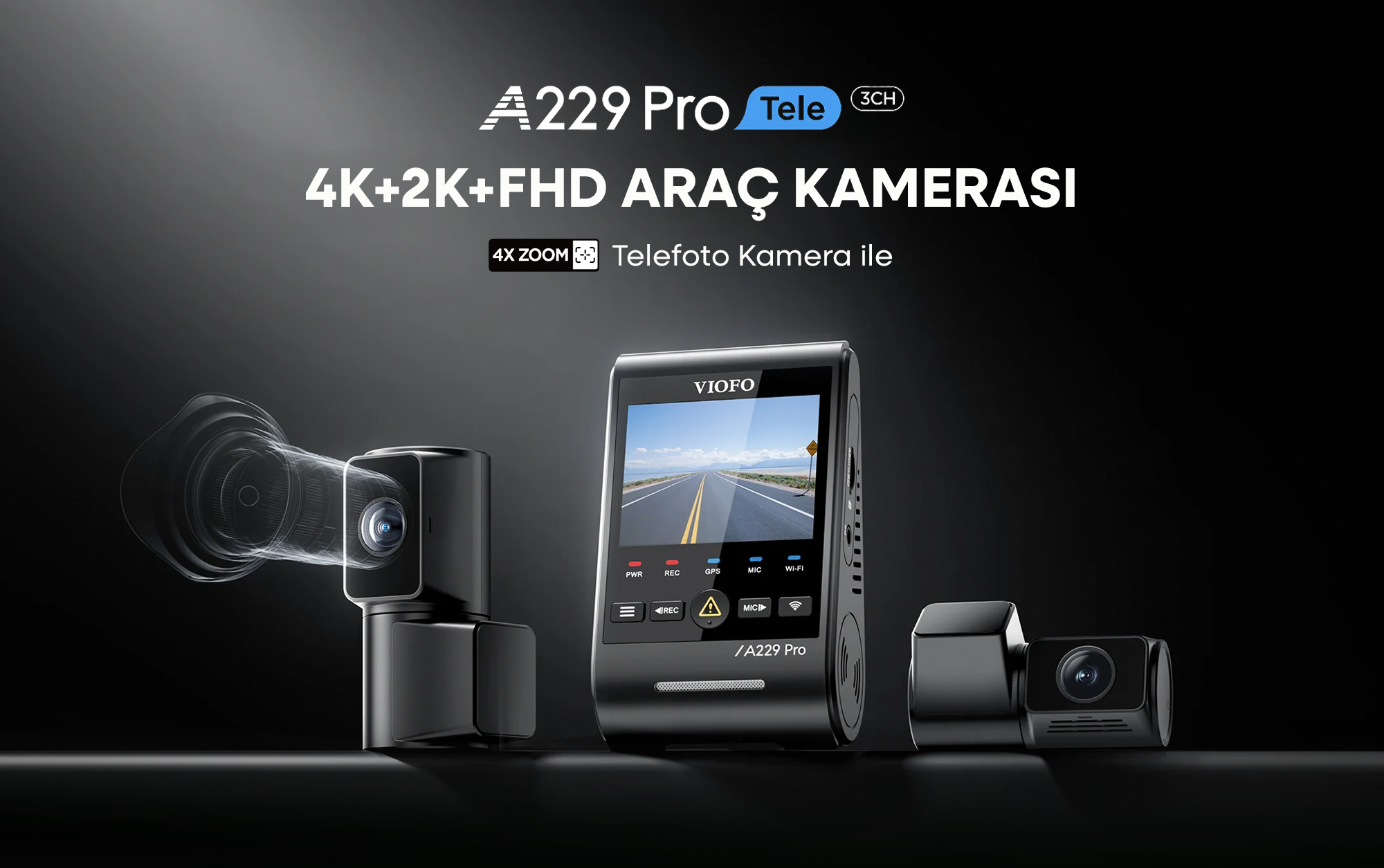 Viofo A229 Pro Tele 3 Kameralı, plaka okuma ve uzaktaki detayları net bir şekilde yakalama konusunda özel olarak tasarlanmış yenilikçi bir araç güvenlik sistemidir. 4K geniş açılı ön kamera, 4x optik zoomlu 2K telefoto kamera ve 1080P arka kamera kombinasyonu sayesinde hem geniş yol perspektifini hem de uzaktaki araç plakalarını eş zamanlı olarak net şekilde kayıt altına alır. Sony STARVIS 2 sensör teknolojisi ile donatılmış bu sistem, her koşulda üstün görüntü kalitesi sunarken, 4x optik zoom özelliği sayesinde uzaktaki detayları kayıplara uğramadan yakalar. Gelişmiş park modu ve ultra hızlı Wi-Fi 6 bağlantısı ile birleşerek sürüş güvenliğinizi en üst seviyeye çıkarır.