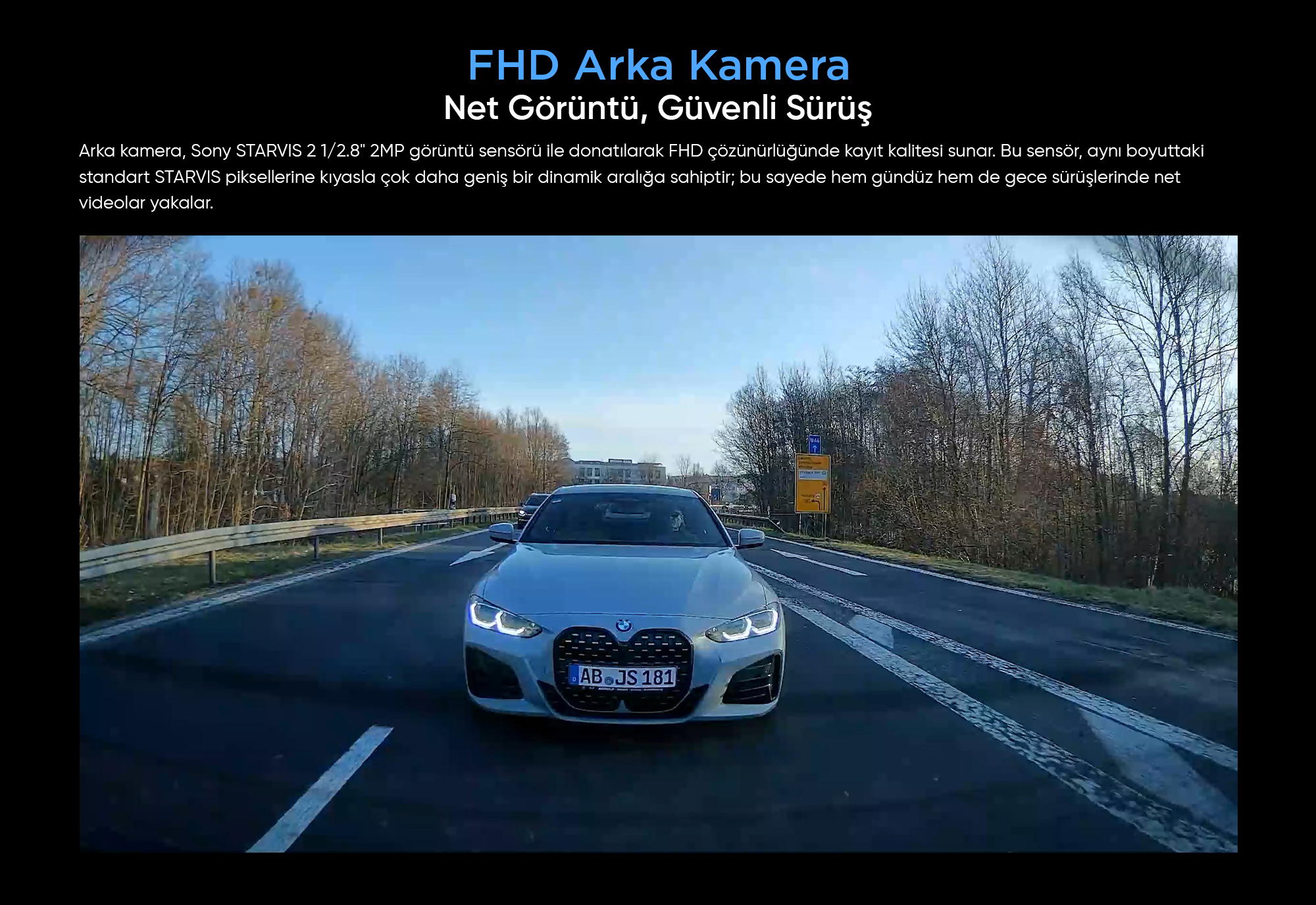 Sony STARVIS 2 IMX662 1/2.8" 2MP sensörüne sahip 1080P arka kamera, F1.8 diyafram açıklığı ve 160° geniş görüş açısı ile üstün görüntü kalitesi sunar. Hem gündüz hem de gece koşullarında net kayıt yapabilme yeteneğine sahip olan bu kamera, aracınızın arkasında oluşan tüm olayları kanıt niteliğinde kaydeder. Geniş görüş açısı sayesinde kör noktalar minimuma indirilerek tam koruma sağlanır.