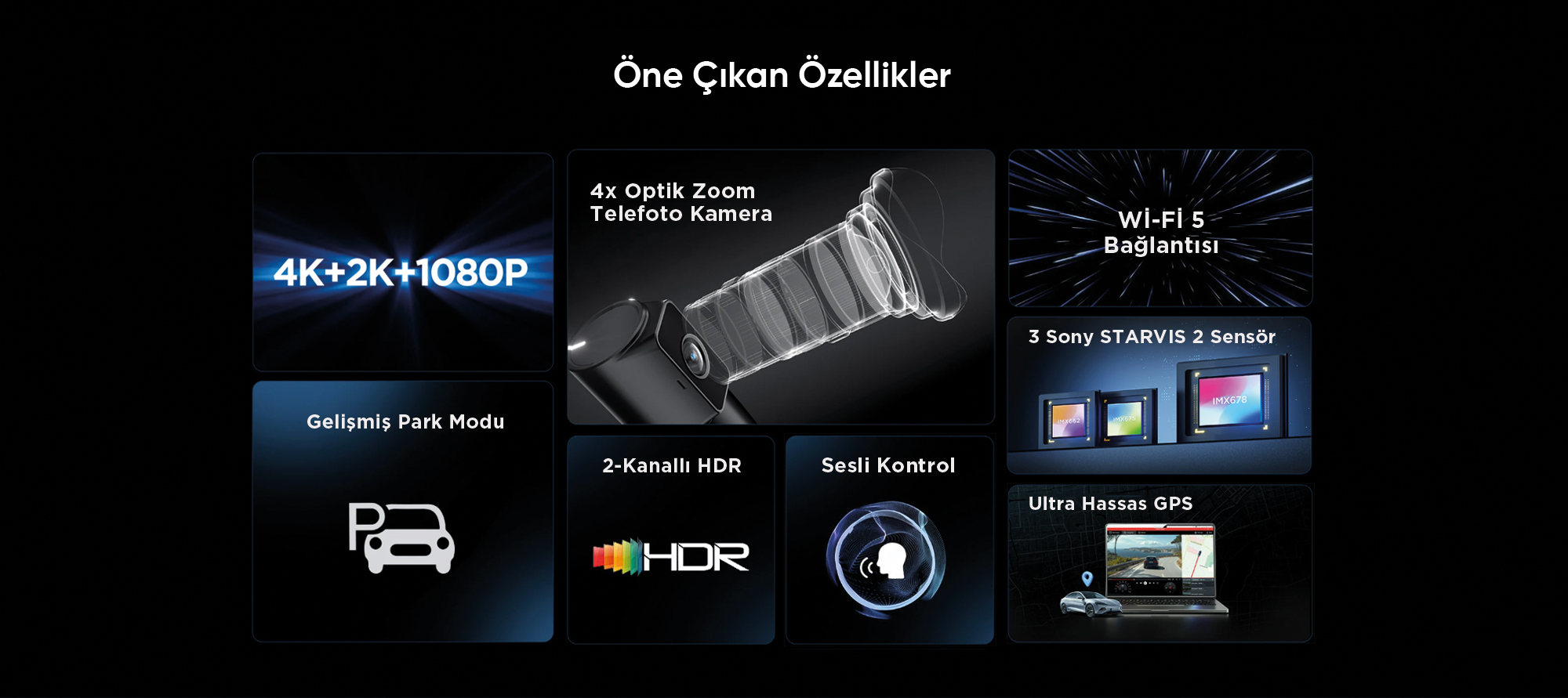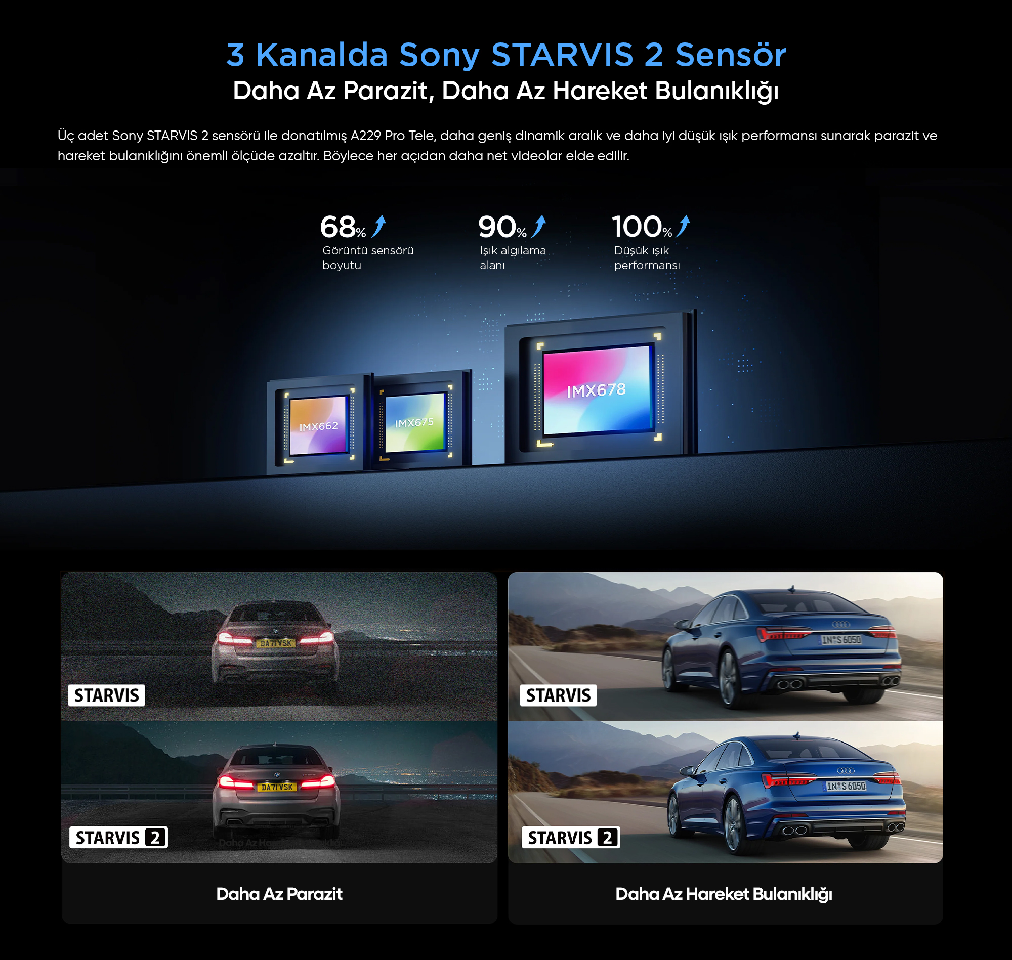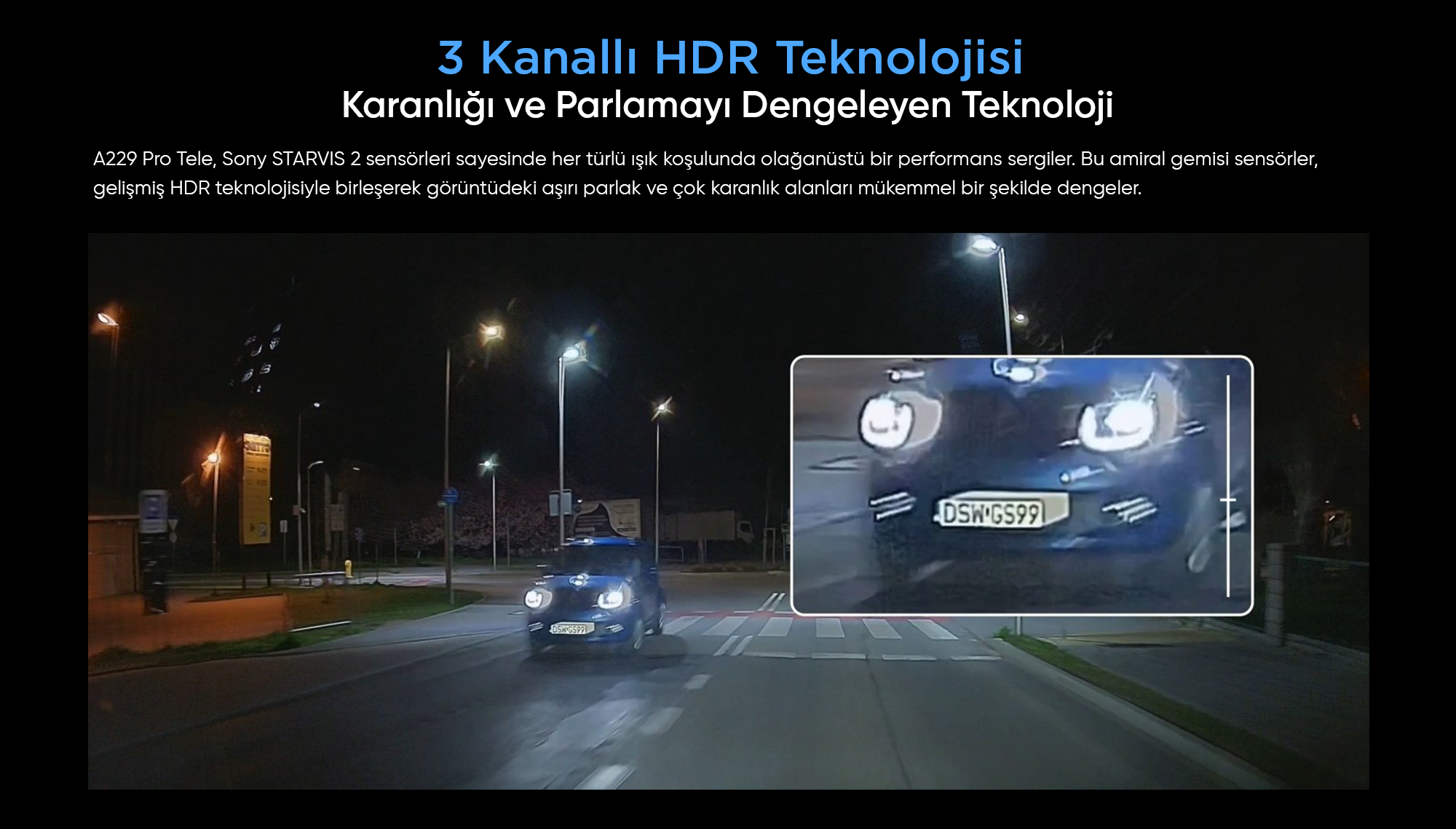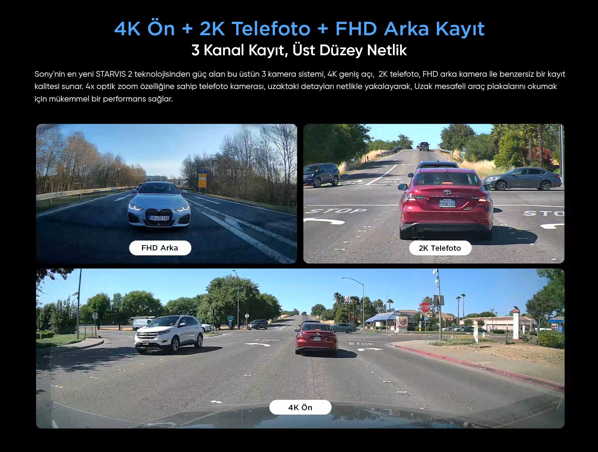 Sony STARVIS 2 sensörler ve gelişmiş HDR teknolojisi kombinasyonu, aşırı parlak ve karanlık alanlar arasında mükemmel denge kurarak net görüntü üretir. Özellikle gün batımı veya tünel çıkışlarında bile tüm detayları kaybetmeden kayıt yapmanızı sağlar. Plaka okuma performansını artıran bu teknoloji, hem 4K ön kamerada hem 2K telefoto kamerada hem de 1080P arka kamerada HDR desteği sunarak uzaktaki plakaları bile net bir şekilde yakalar.