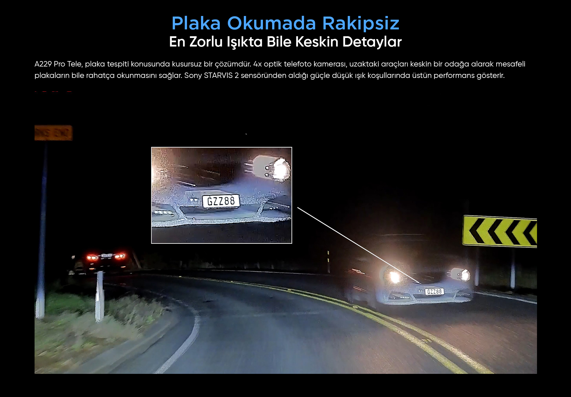 A229 Pro Tele, özellikle uzaktaki araç plakalarını net bir şekilde okumak istediğiniz durumlarda büyük avantaj sağlar. Otoyol sürüşlerinde, hızlı akan trafikte veya park halindeyken uzaktan yaklaşan araçların plakalarını kaydetmek için idealdir. 4x optik zoom özelliği sayesinde dijital zoomdan kaynaklanan görüntü bozulması yaşanmaz.