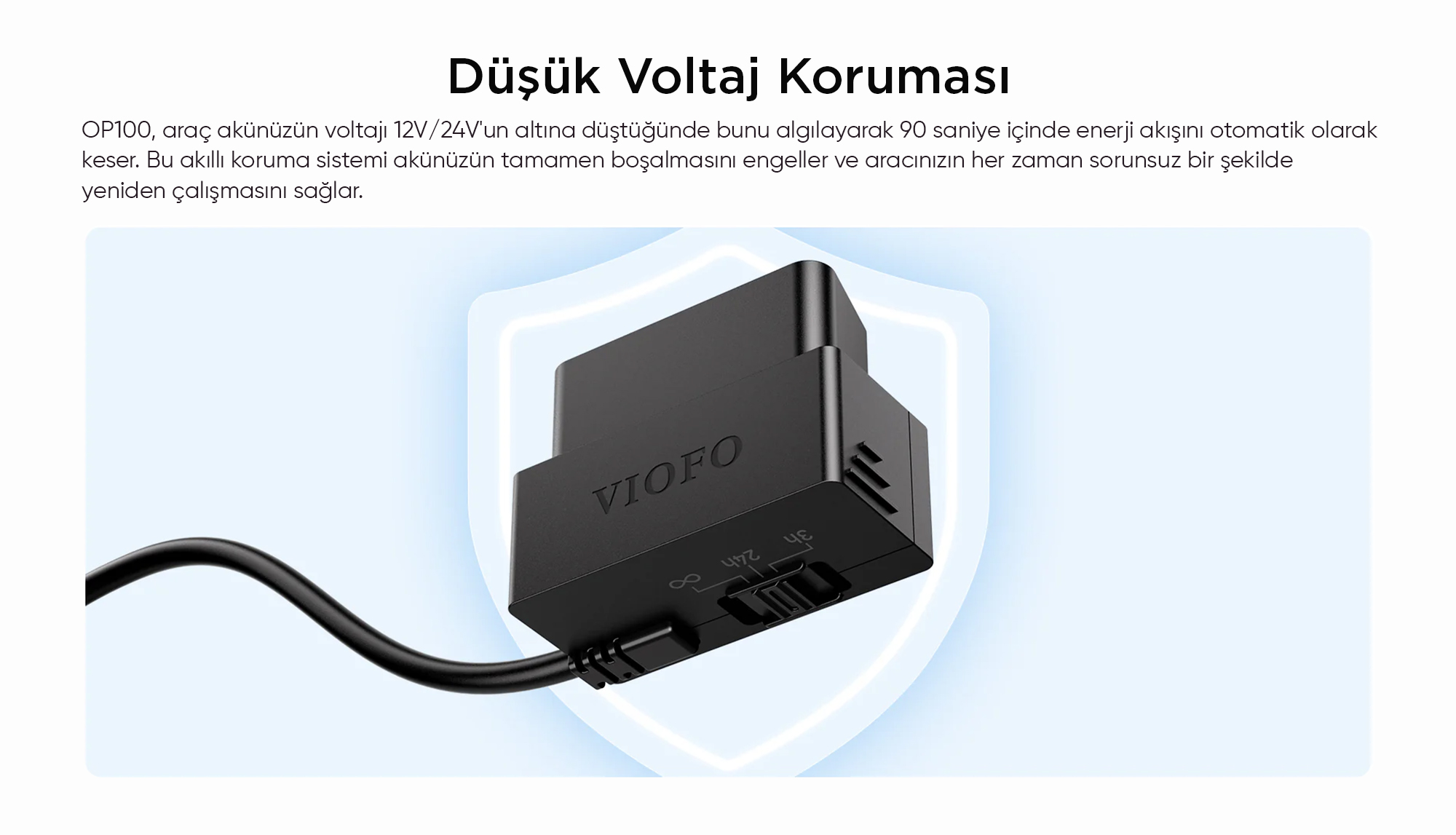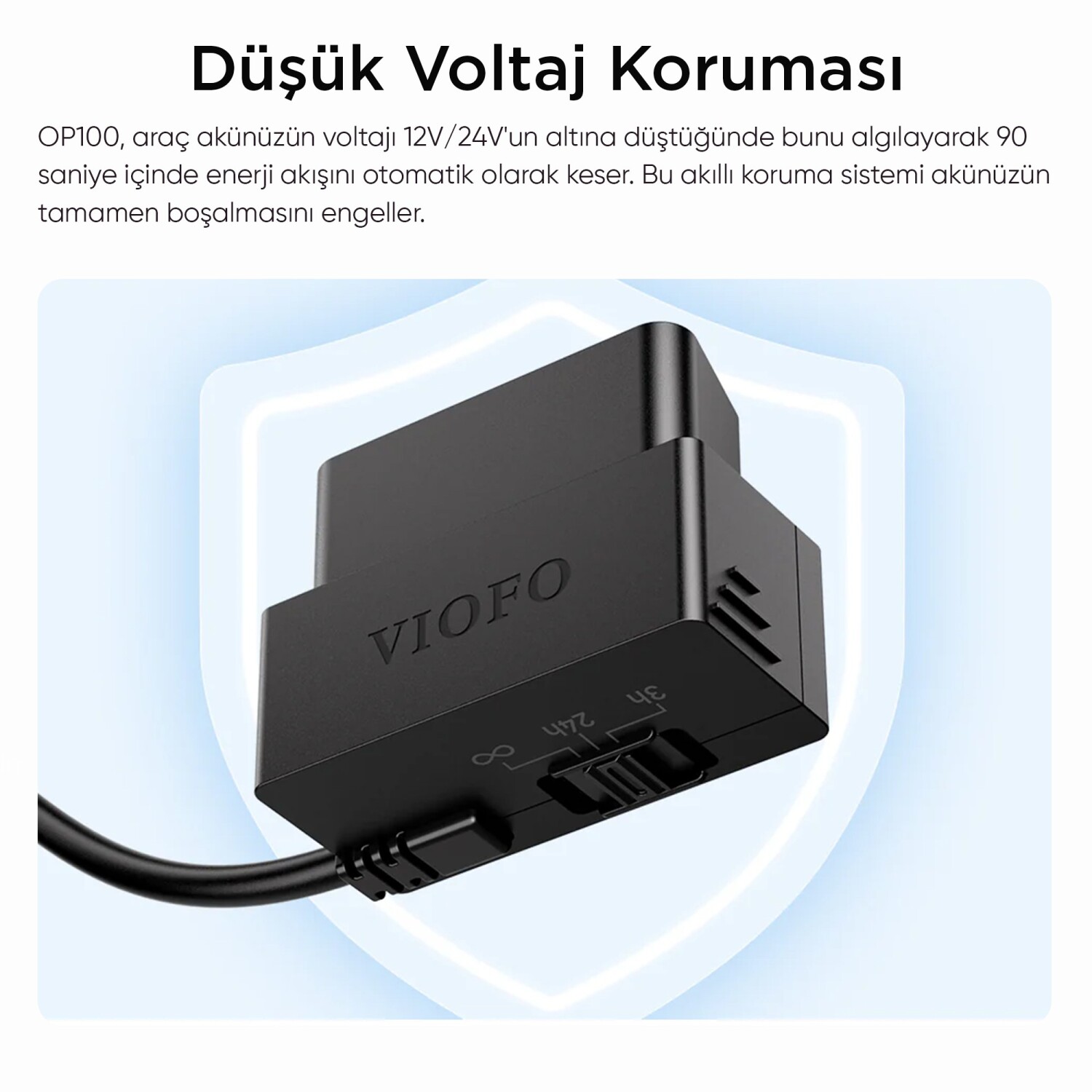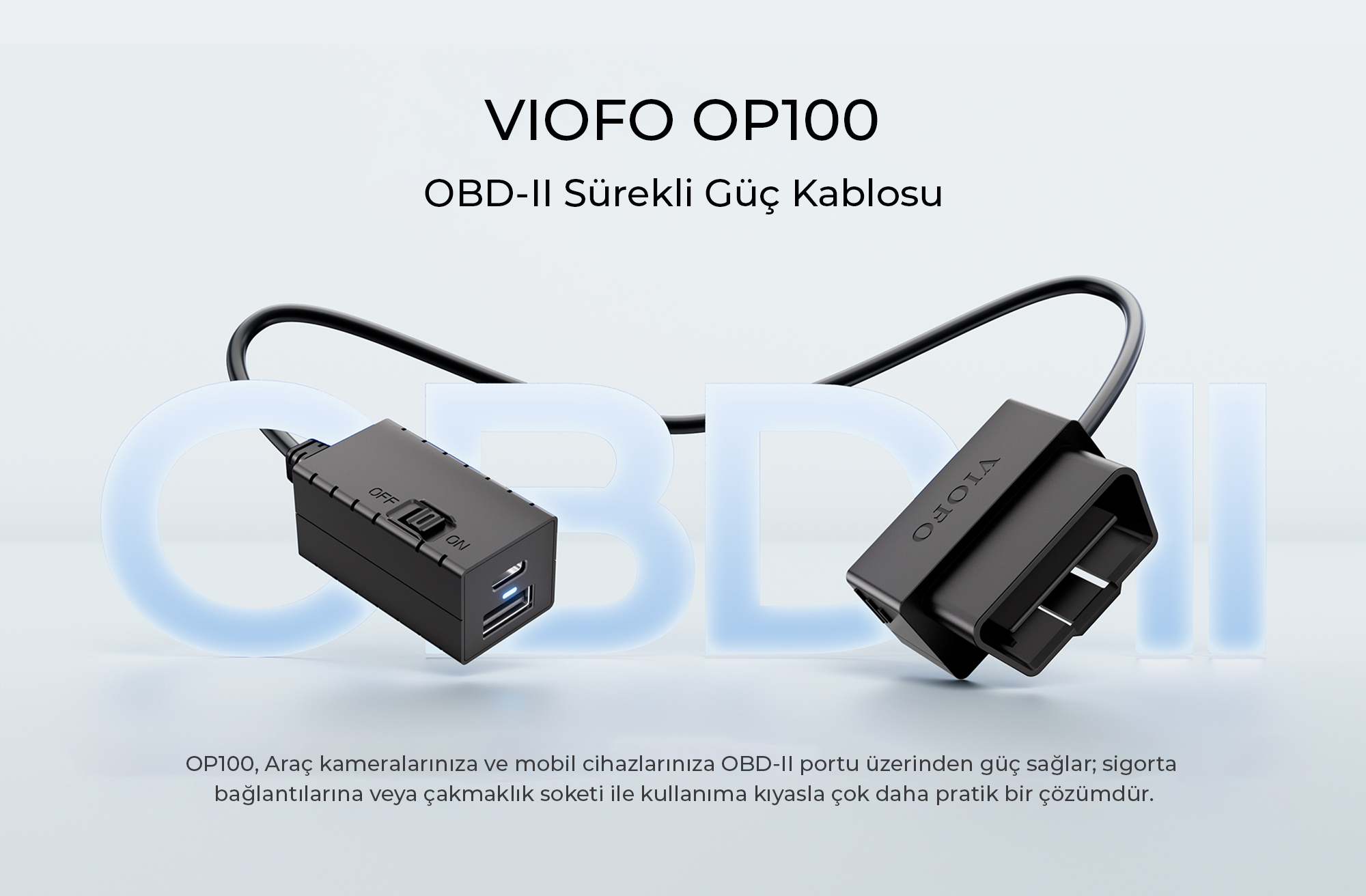 Viofo OP100 OBD-II Park Modu Bağlantı Kiti, araç kamerası ve mobil cihazlarınıza OBD-II portu üzerinden sürekli güç sağlar. Çift çıkış portu sayesinde hem araç kamerasına hem de akıllı telefonunuza aynı anda güç verebilirsiniz. Ayarlanabilir Güç Anahtarı ile aracınız park halindeyken dahi kameranızın kesintisiz çalışmasını sağlarken, akünüzün zarar görmesini önler.