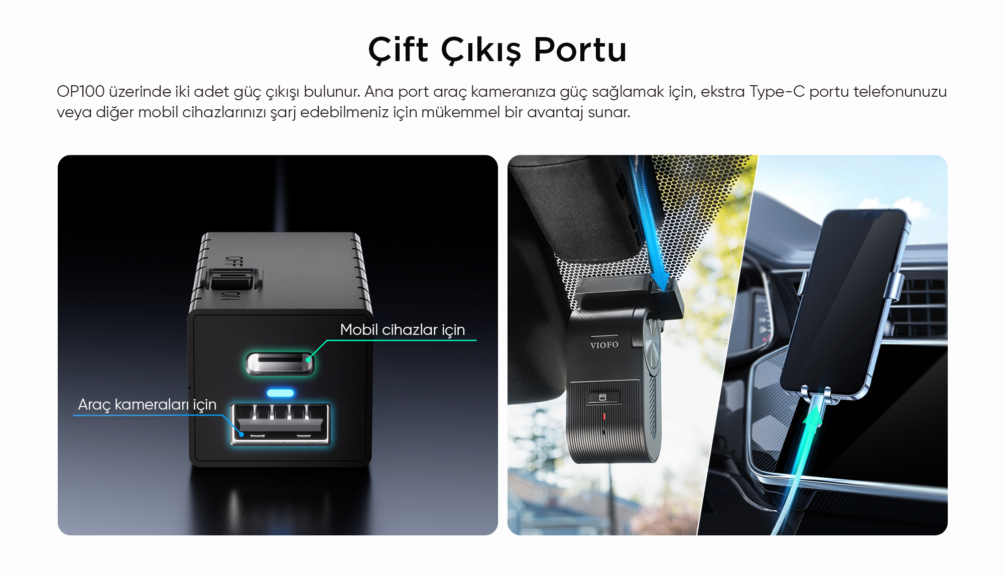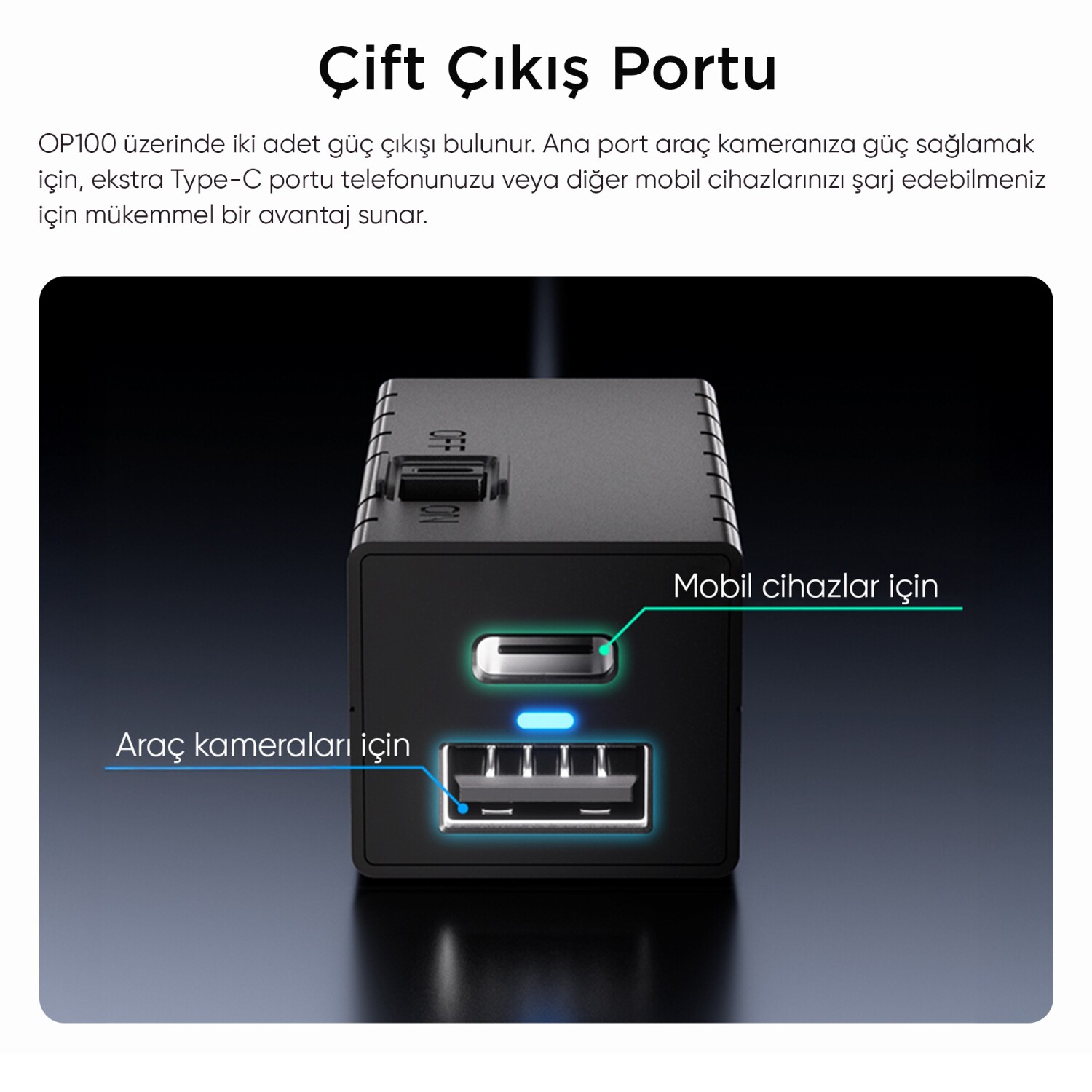 OP100 üzerinde iki farklı güç çıkışı bulunur; USB-A portu araç kamerasına, Type-C portu ise akıllı telefon veya diğer mobil cihazlarınızı şarj etmek için tasarlanmıştır. Bu sayede hem kameranız sürekli çalıştırabilir hem de seyahat esnasında cihazlarınızı şarj edebilirsiniz.