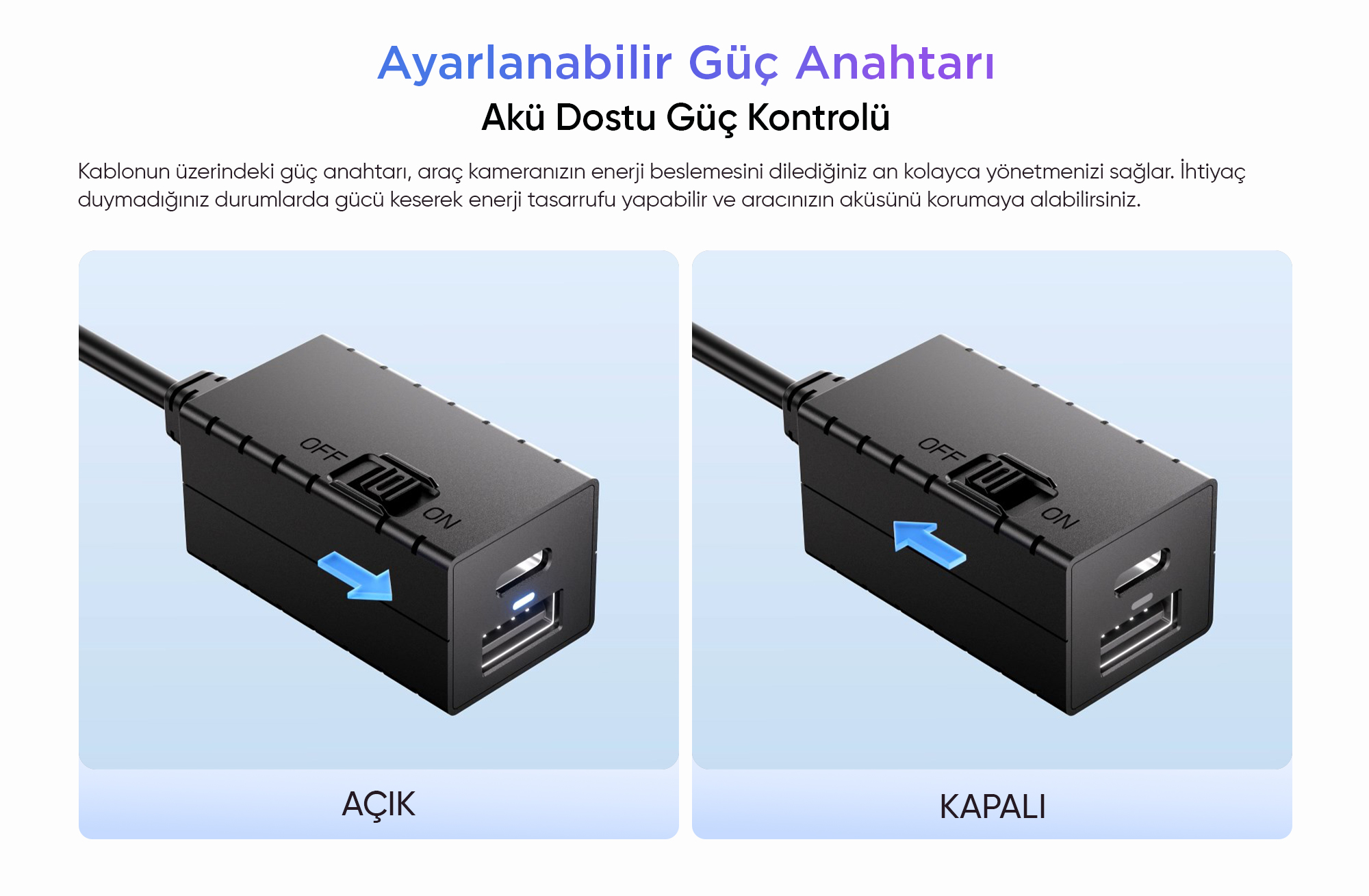 OBD Kitinin üzerindeki fiziksel güç anahtarı, araç kamerasının enerji beslemesini istediğiniz zaman kolayca yönetmenizi sağlar. Uzun süreli park durumlarında veya bakım sırasında gücü keserek enerji tasarrufu sağlayabilir ve akü ömrünü koruyabilirsiniz.
