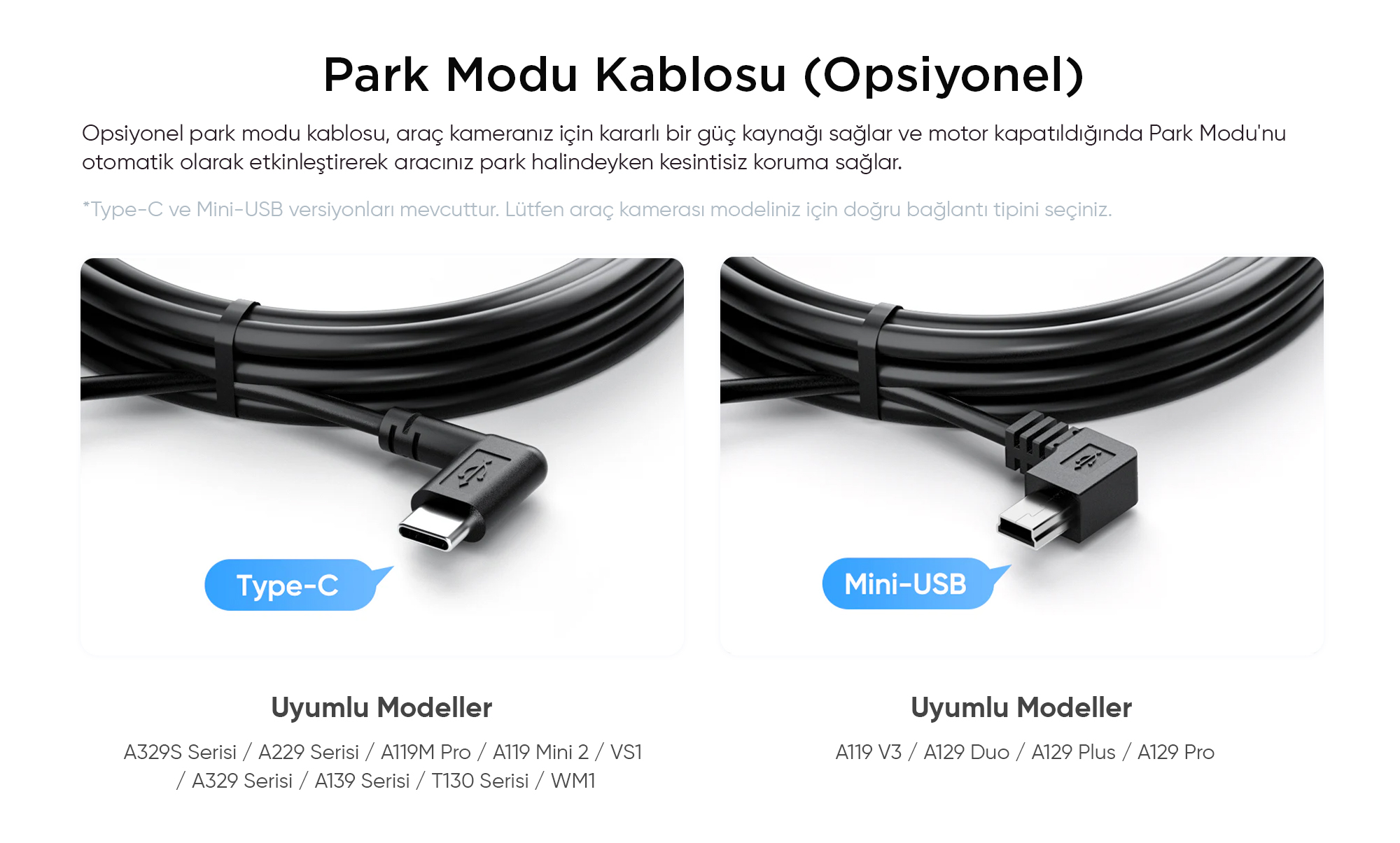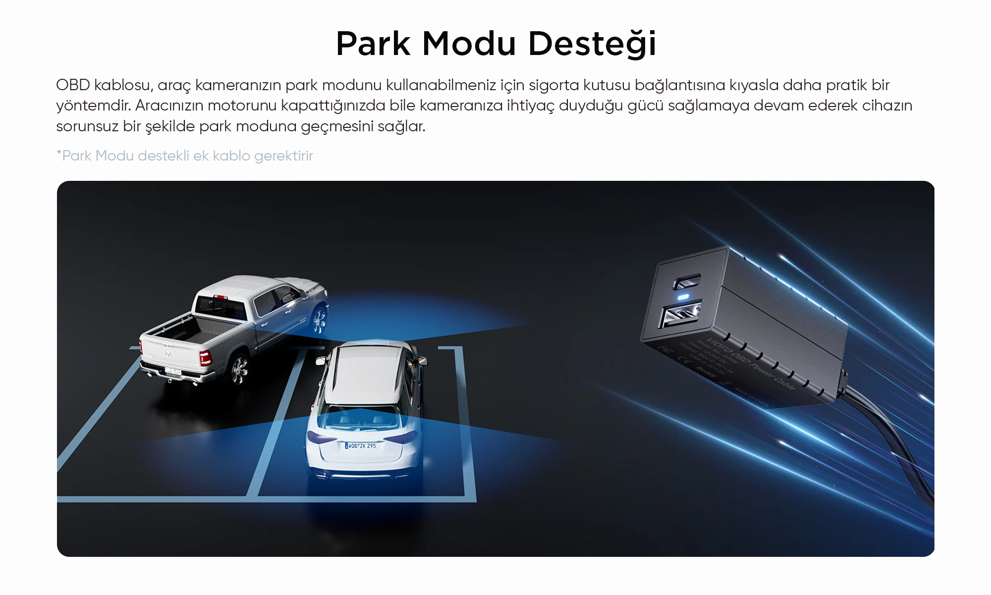• Park Modu: Destekler (Type-C veya Mini-USB opsiyonel park modu kablosu gerektirir)