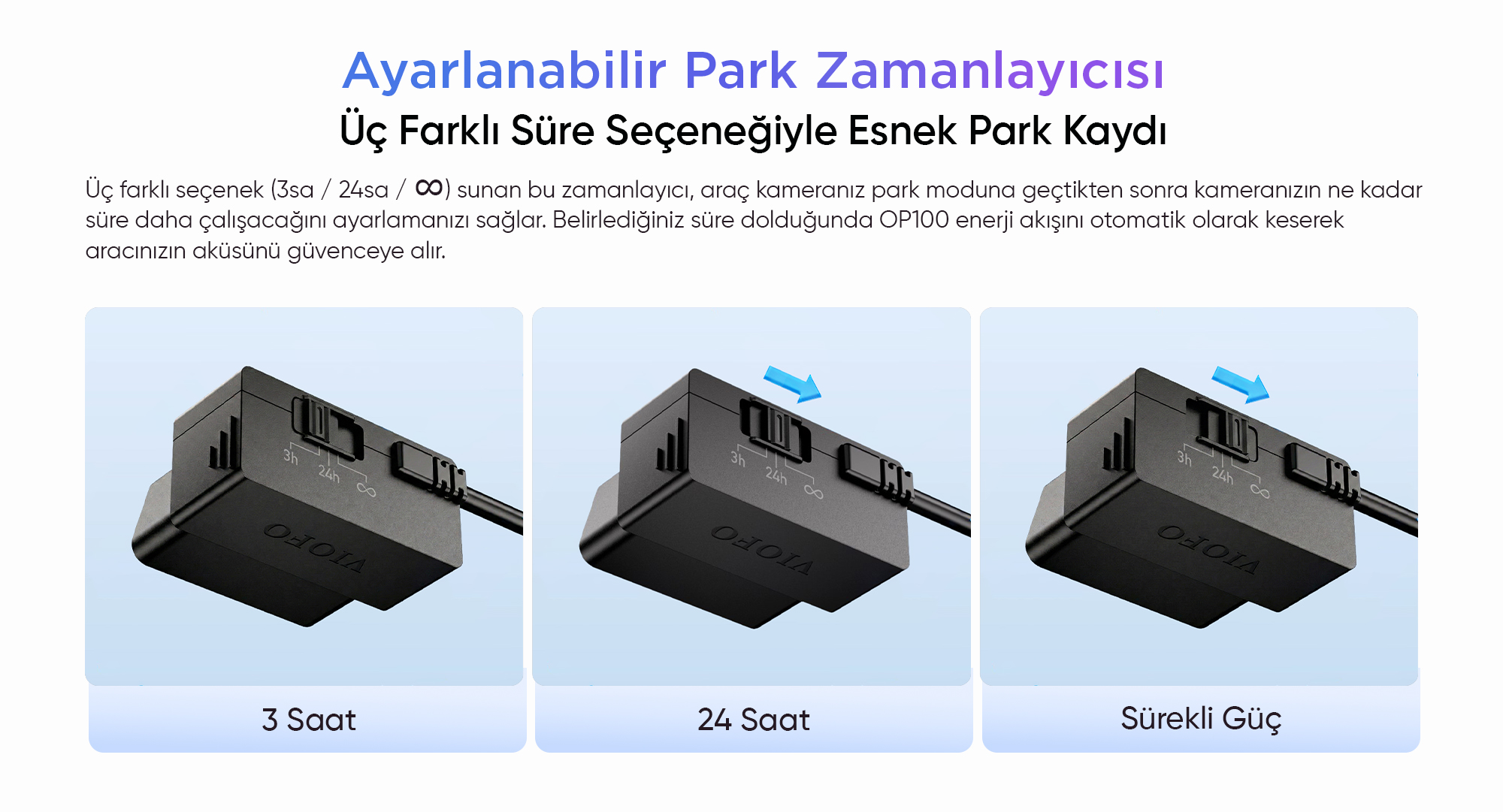 Ayarlanabilir park zamanlayıcısı, araç kameranız park moduna geçtikten sonra kameranın ne kadar süre çalışacağını belirlemenize olanak tanır. Üç farklı süre seçeneği sunan bu akıllı sistem ile 3 saat, 24 saat veya sürekli güç modları arasından ihtiyaçlarınıza uygun olanı seçebilirsiniz. Belirlediğiniz süre dolduğunda OP100 OBD-II park modu kiti enerji akışını otomatik olarak keserek aracınızın aküsünün gereksiz boşalmasını engeller ve akü güvenliğinizi korur.