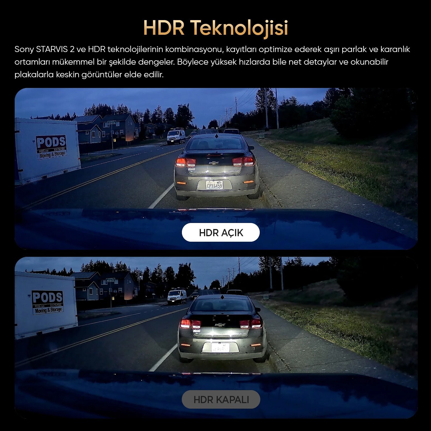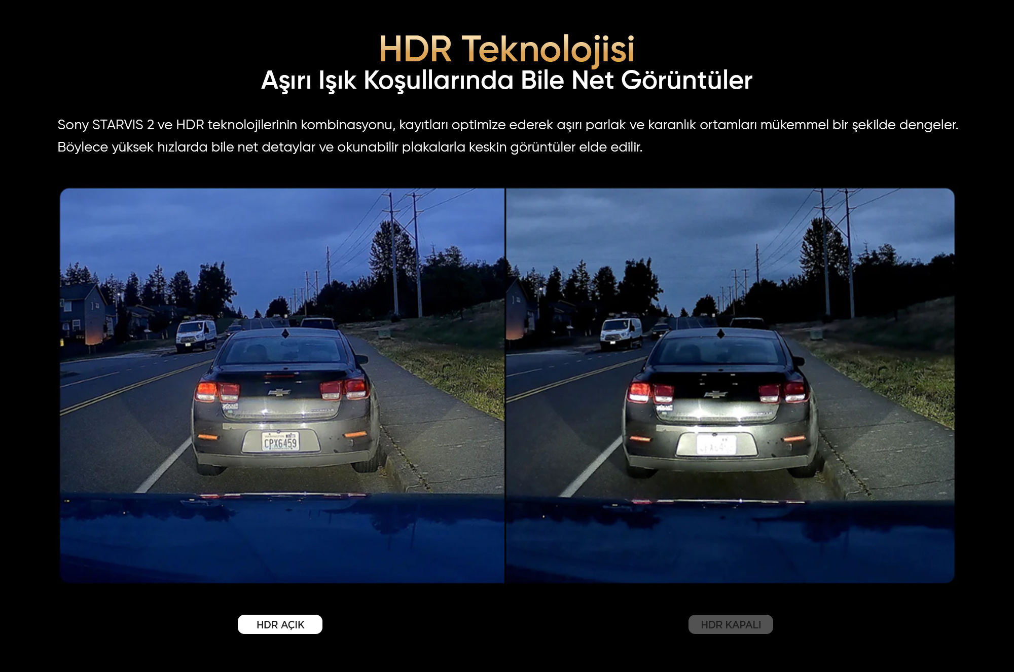 Sony STARVIS 2 ve HDR teknolojilerinin kombinasyonu, kayıtları optimize ederek aşırı parlak ve karanlık ortamları mükemmel bir şekilde dengeler. Böylece yüksek hızlarda bile net detaylar ve okunabilir plakalarla keskin görüntüler elde edilir.