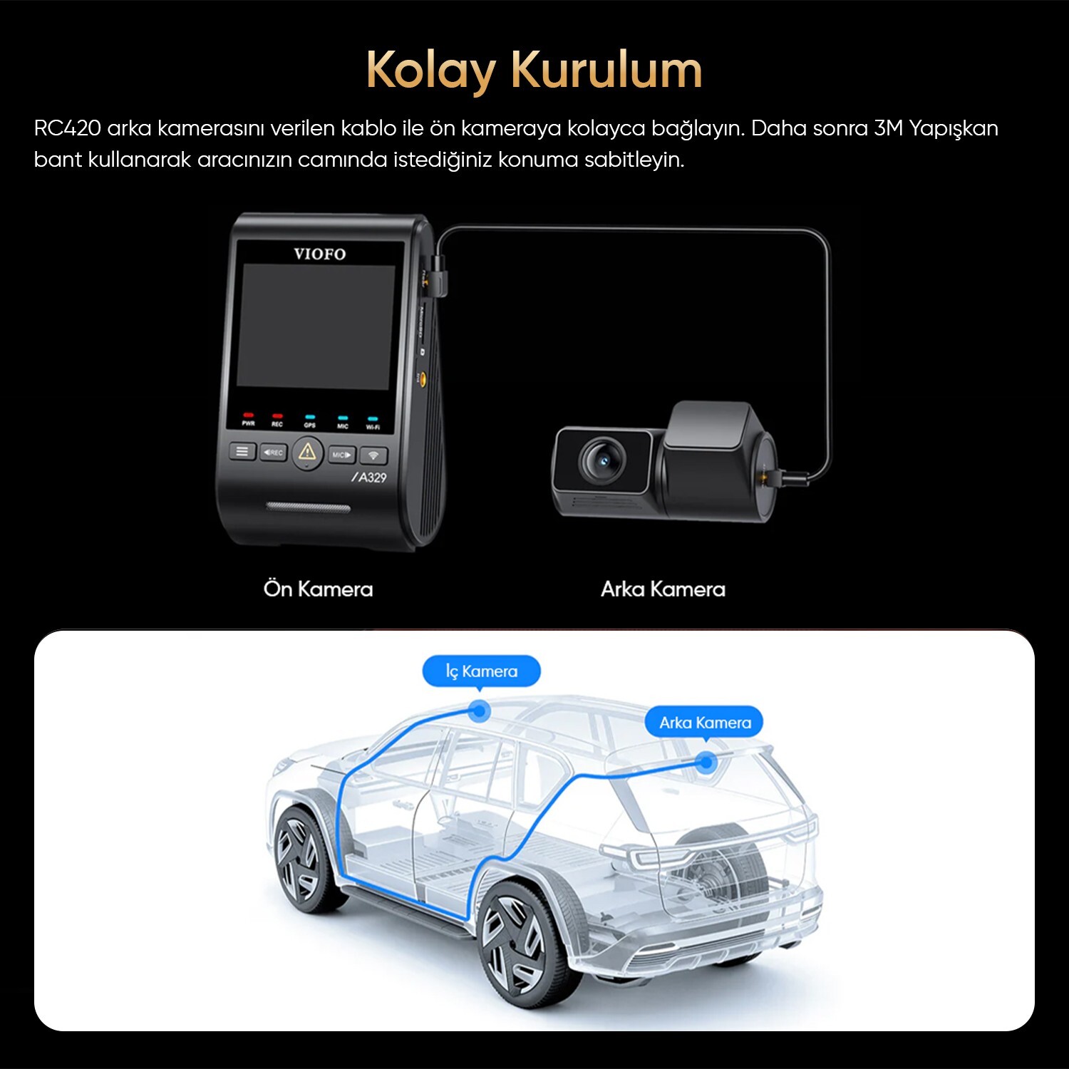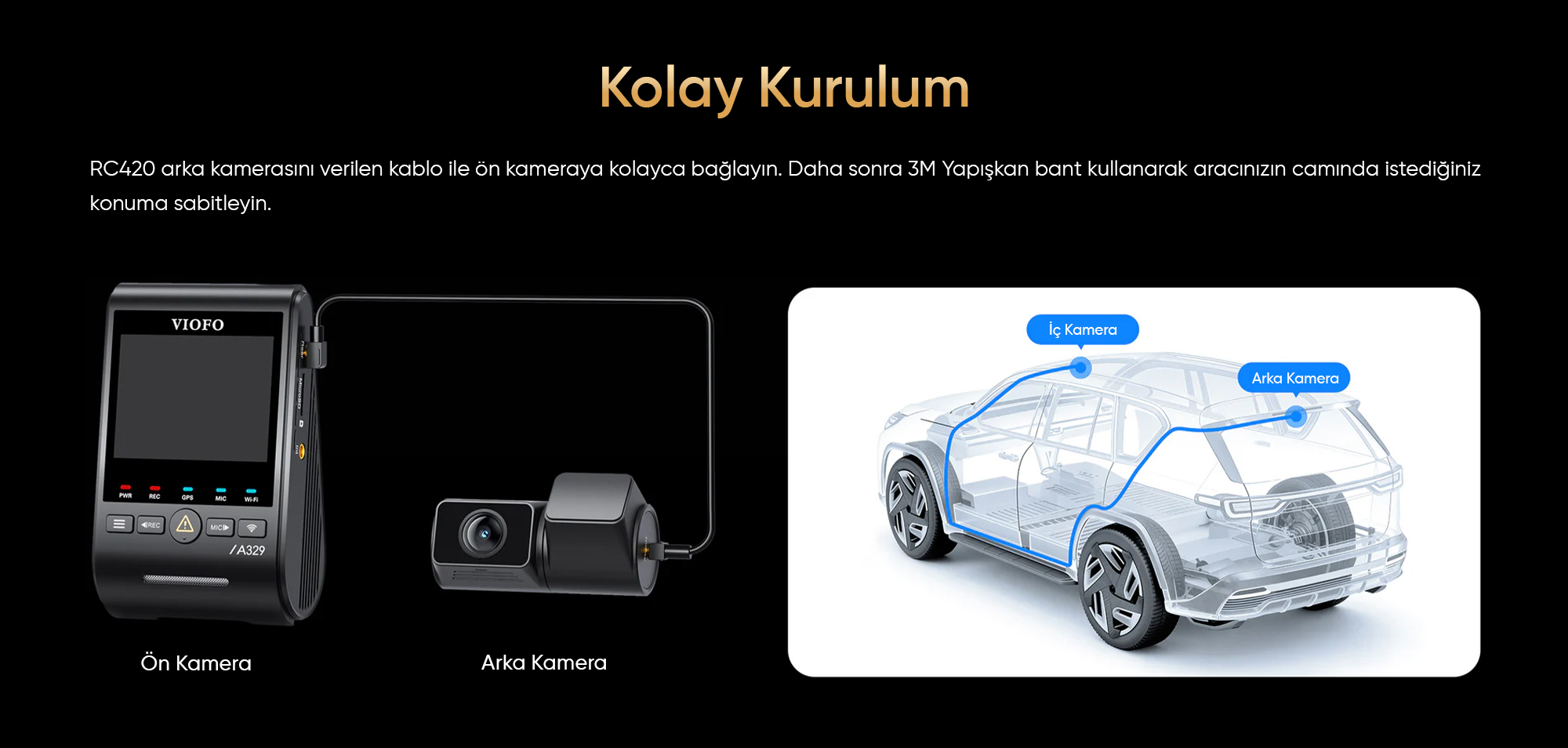 Viofo RC420 arka kamerası, Pakette bulunan 6 metre uzunluğundaki koaksiyel kablo ile ön kameraya kolayca bağlanır. Arka cama montaj için özel olarak tasarlanmış 3M yapışkan ped sayesinde kamera istenilen konuma hızlıca sabitlenir. Ekstra olarak verilen yedek yapışkan ped ile gerektiğinde yeniden konumlandırma imkanı sunar.