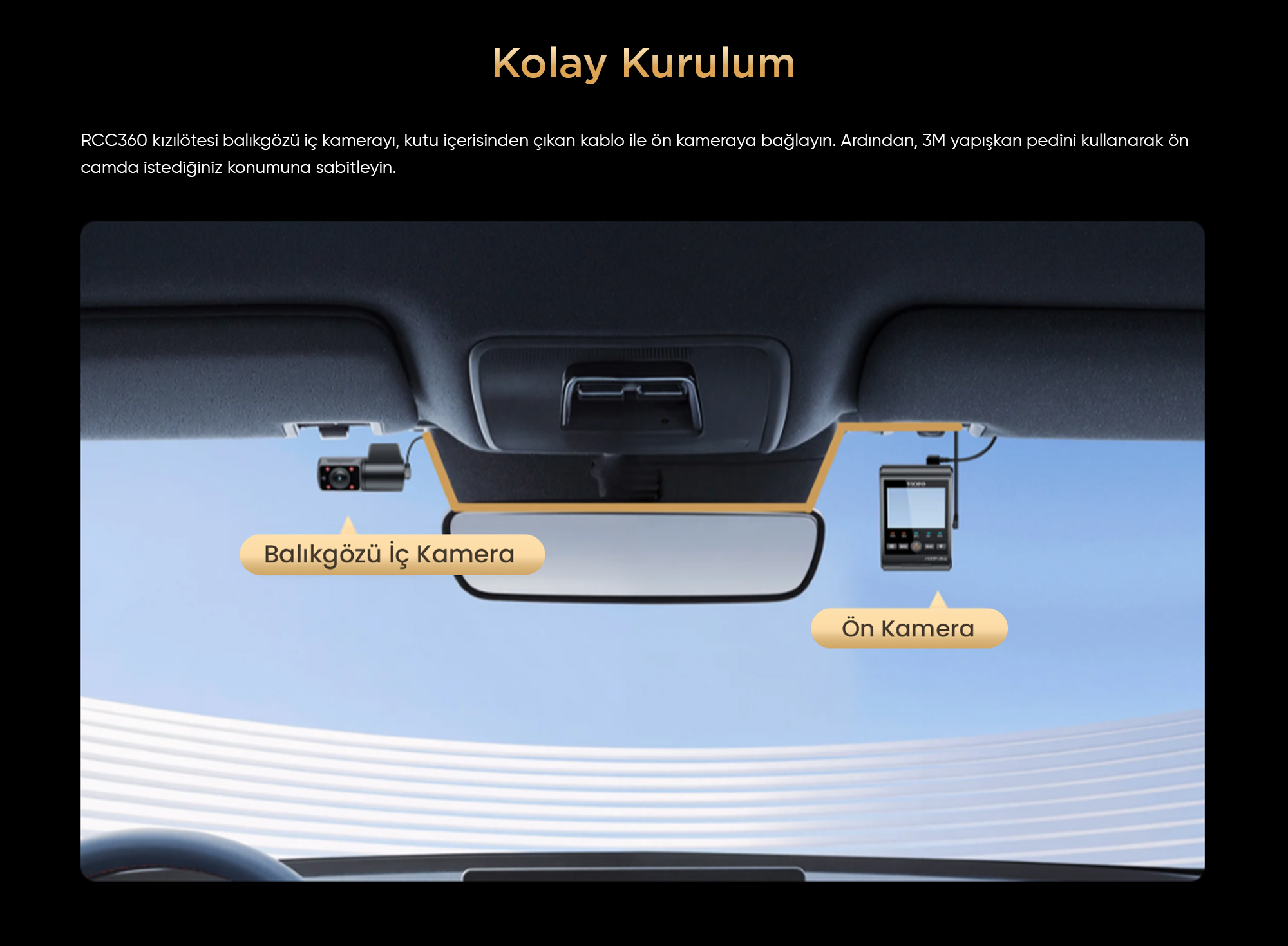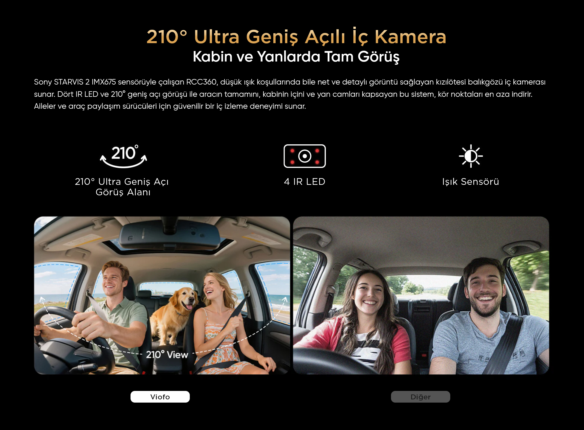 RCC360, 210° ultra geniş görüş açısı ile aracınızın tamamını kapsar. Balık gözü lens teknolojisi sayesinde kör noktaları minimuma indirerek hem sürücü hem de yolcu güvenliğini maksimum seviyede tutar. Özellikle taksi, Uber ve yolcu taşıyan araçlar için iç mekan olaylarını net bir şekilde kayıt altına almanızı sağlar.