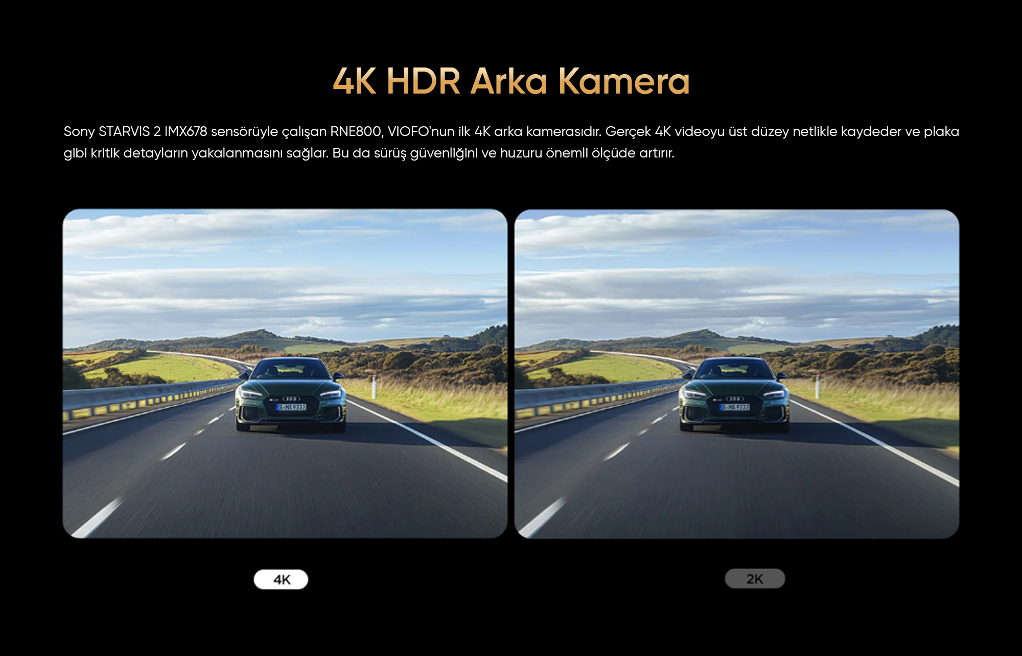 VIOFO'nun ilk 4K arka kamerası olan RNE800, Sony STARVIS 2 IMX678 1/1.8" 8MP sensörü ile donatılmıştır. Gerçek 4K çözünürlükte (3840x2160P) kayıt yaparak plaka numaraları ve diğer kritik detayları net bir şekilde yakalar. Özellikle yüksek hızlarda ve hareket halindeyken bile mükemmel performans sergiler. Bu arka kamera, sürüş güvenliğinizi ve olası kaza durumlarında kanıt niteliğinde kayıtlar elde etmenizi sağlar.