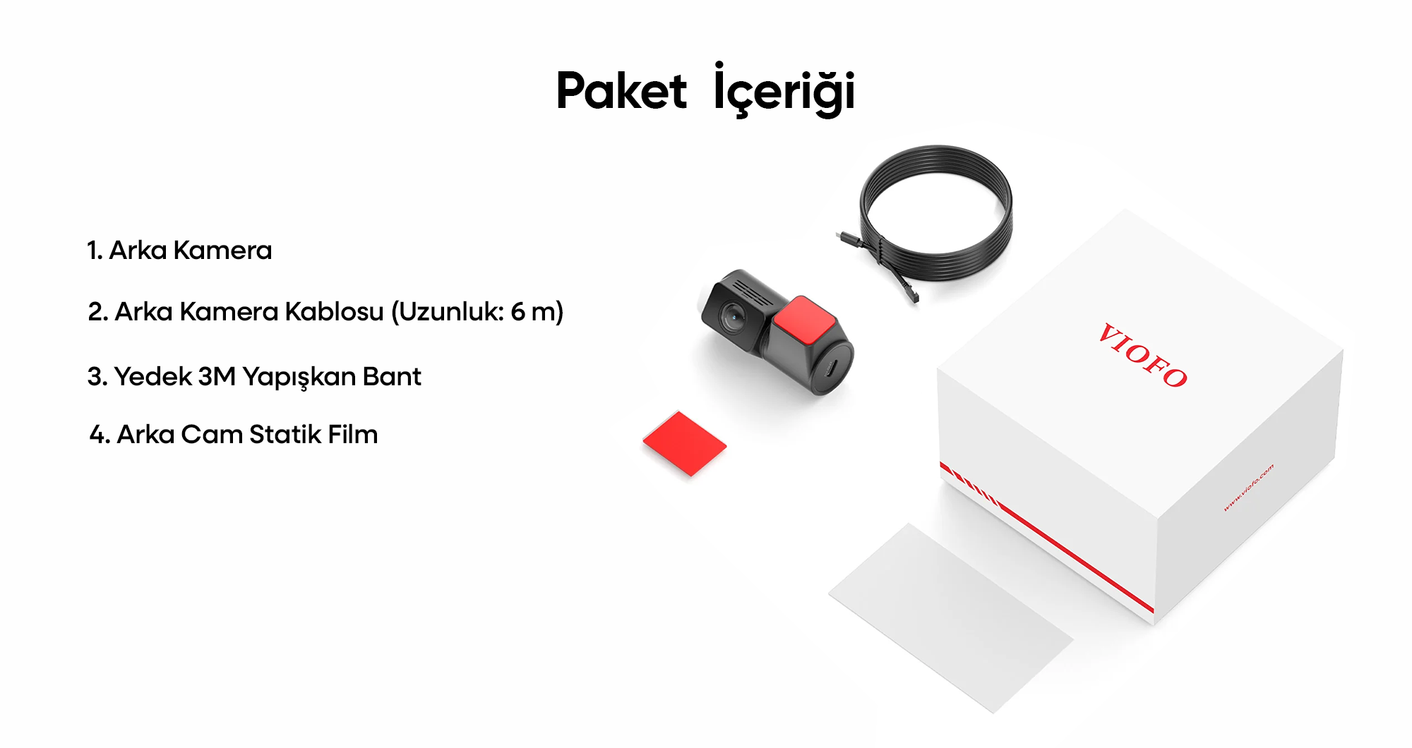 VIOFO RNE800 arka kamerası, 6 metre uzunluğundaki özel kablo ile ön kameraya doğrudan bağlanarak kolay kurulum imkanı sunar. Montaj için özel olarak tasarlanmış 3M yapışkan bant ve statik cam filmi ile aracınızın arka camından istediğiniz konuma hızlı ve güvenli bir şekilde sabitlenebilir. Kurulum kitinde yer alan ekstra yapışkan bant sayesinde kamera, istenilen konuma kolayca yerleştirilebilir ve gerektiğinde tekrar konumlandırılabilir.