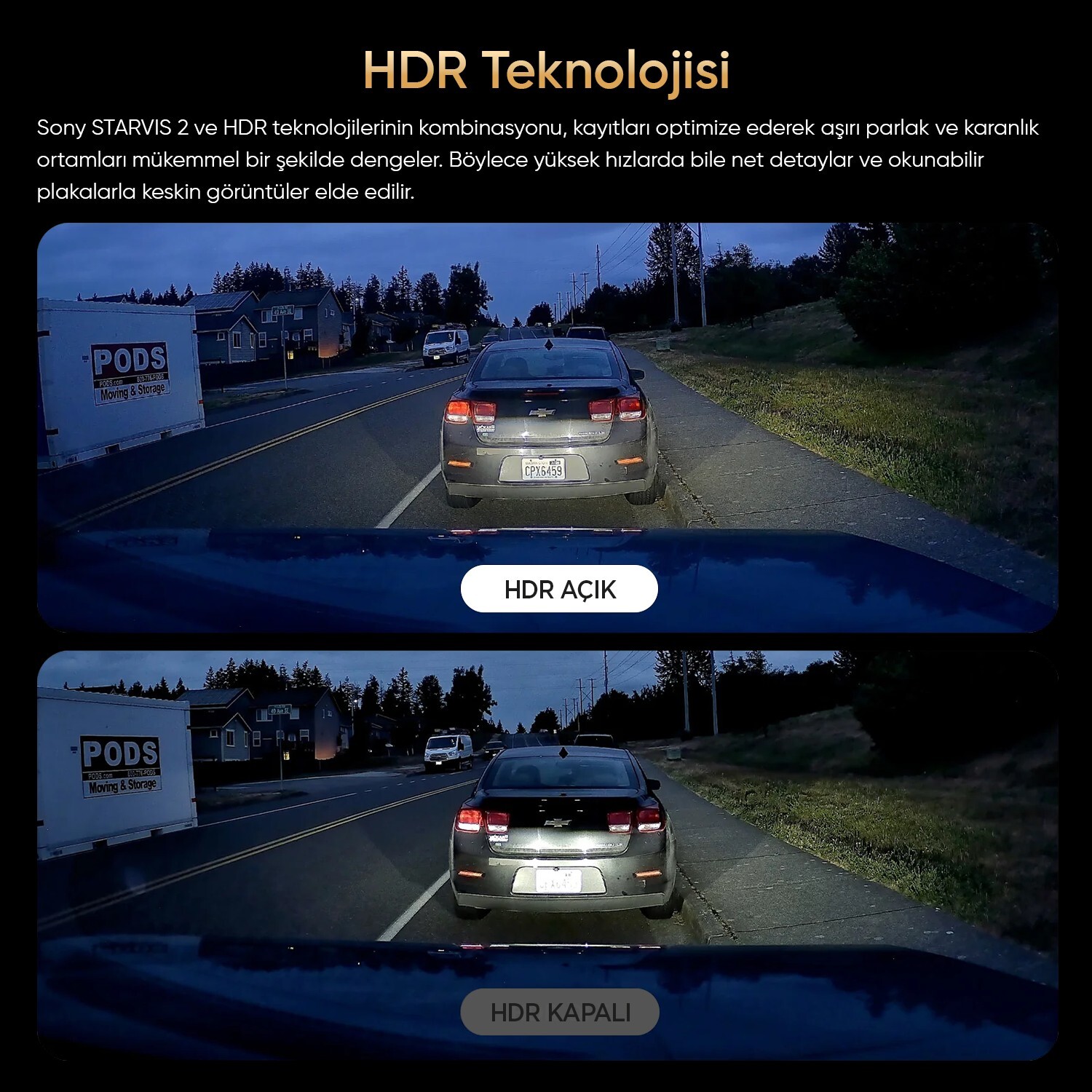 RNE800'ün gelişmiş HDR (High Dynamic Range) teknolojisi, parlak güneş ışığı altında veya koyu gölgelerde bile mükemmel bir denge kurarak tüm detayları net bir şekilde kaydeder. Özellikle gün batımında veya tünel çıkışlarında bile arkanızdan gelen araçların plaka numaralarını kolayca okuyabilirsiniz.