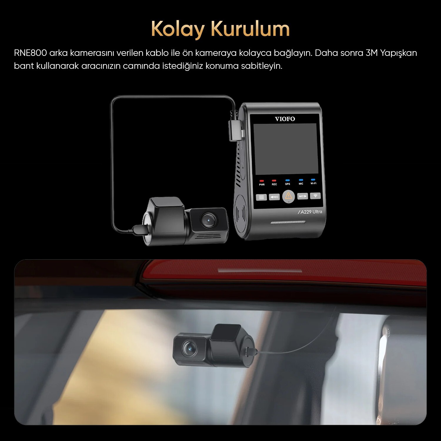 VIOFO RNE800 A229 Ultra Uyumlu 4K Ultra HD Arka Kamera , A229 Ultra serisi araç kameraları için özel olarak tasarlanmış yüksek performanslı bir arka kameradır. Sony STARVIS 2 IMX678 sensörü ve gelişmiş HDR teknolojisi sayesinde son derece net detaylarla 4K çözünürlükte kayıt kalitesi sunar. Gelişmiş HDR teknolojisi sayesinde parlak güneşli günlerde veya karanlık tünellerde bile tüm detayları net bir şekilde kaydeder. 6 metre uzunluğundaki özel kablo ile kolay kurulum imkanı sağlar ve 3M yapışkan bant ile cam yüzeyine güvenli bir şekilde monte edilebilir.