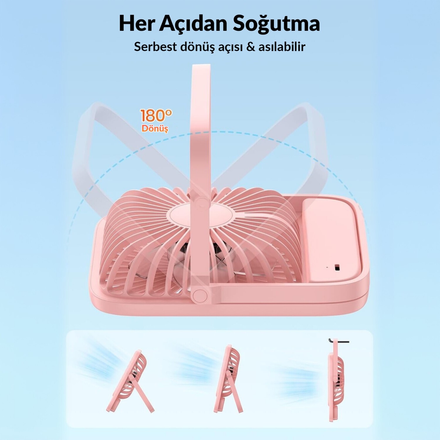 Vantilatörün arka kısmına entegre edilmiş U şeklindeki katlanabilir standı, hava akımını tam olarak istediğiniz açıya yönlendirmenizi sağlar. Standı açarak cihazı masanızda dengeli bir şekilde konumlandırabilir, hava akımının yüzünüze veya boynunuza doğru en doğru açıyla gelmesini sağlayabilirsiniz. Seyahat ederken veya kullanmadığınız zamanlarda standı tamamen kapatarak cihazı düz bir tablet formuna dönüştürebilirsiniz.