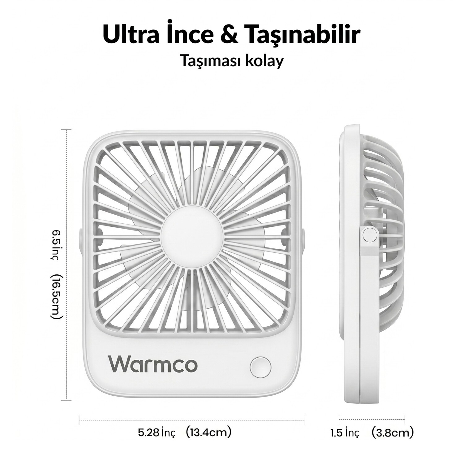Warmco D1 Ultra İnce (Ultra-thin) Masaüstü USB Vantilatör, birkaç santimetre kalınlığındaki minimal gövdesi ve arkasında yer alan ayarlanabilir (katlanabilir) standı sayesinde cihazı dilediğiniz açıyla masanızın üzerine yerleştirebilir veya işiniz bittiğinde kitap gibi katlayarak çekmecenize kaldırabilirsiniz. Üzerindeki tek tuş kontrolü ile düşük, orta ve yüksek olmak üzere 3 farklı rüzgar kademesi (Low/Medium/High wind) arasından ihtiyacınıza en uygun esintiyi seçebilirsiniz. 5W gücündeki aerodinamik motoru ile sessiz ama son derece etkili bir performans sunan cihaz, kutu içeriğine dahil edilen USB-A ve Type-C bağlantılarına sahip pratik güç kablosuyla bilgisayarınızdan veya adaptörünüzden enerjisini alarak kesintisiz bir şekilde çalışır.