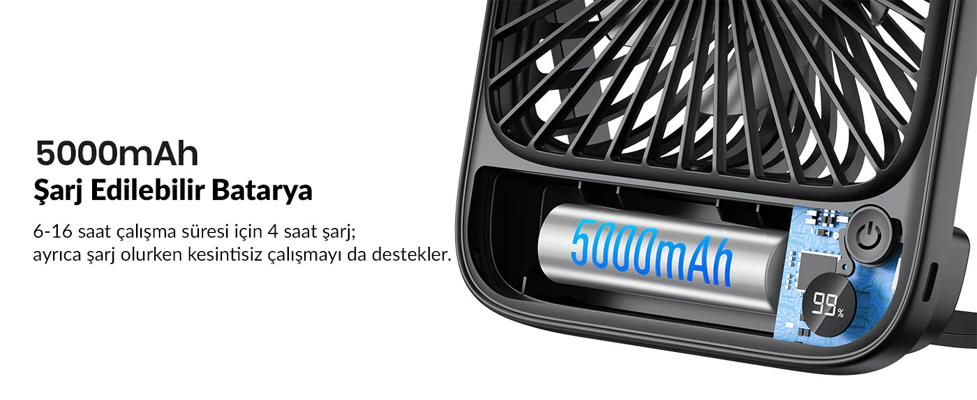 Warmco D2 5000mAh Şarjlı Masaüstü Vantilatör Dijital Göstergeli Taşınabilir Ultra İnce Soğutucu Fan, şarjlı ve akıllı olan bu model, ön panelinde yer alan LED dijital ekran (Digital Display) ile anlık şarj durumunu (0-100) ve çalışma kademesini takip etmenize olanak tanır. Kompakt ve hafif (Compact & Light) yapısı sayesinde çantanızda kolayca taşıyabileceğiniz D2, arka kısmında yer alan 180 derece dönebilen (180° Rotation) ayarlanabilir standı ile hava akımını tam istediğiniz açıdan yüzünüze yönlendirmenizi sağlar. Güç düğmesine dokunarak hafif esintiden (Low wind) kasırga etkisine (Strong wind) kadar 4 farklı hız kademesi arasından seçim yapabilirsiniz. Özel hafıza fonksiyonu, cihazı yeniden açtığınızda son kullandığınız hız ayarını hatırlar.