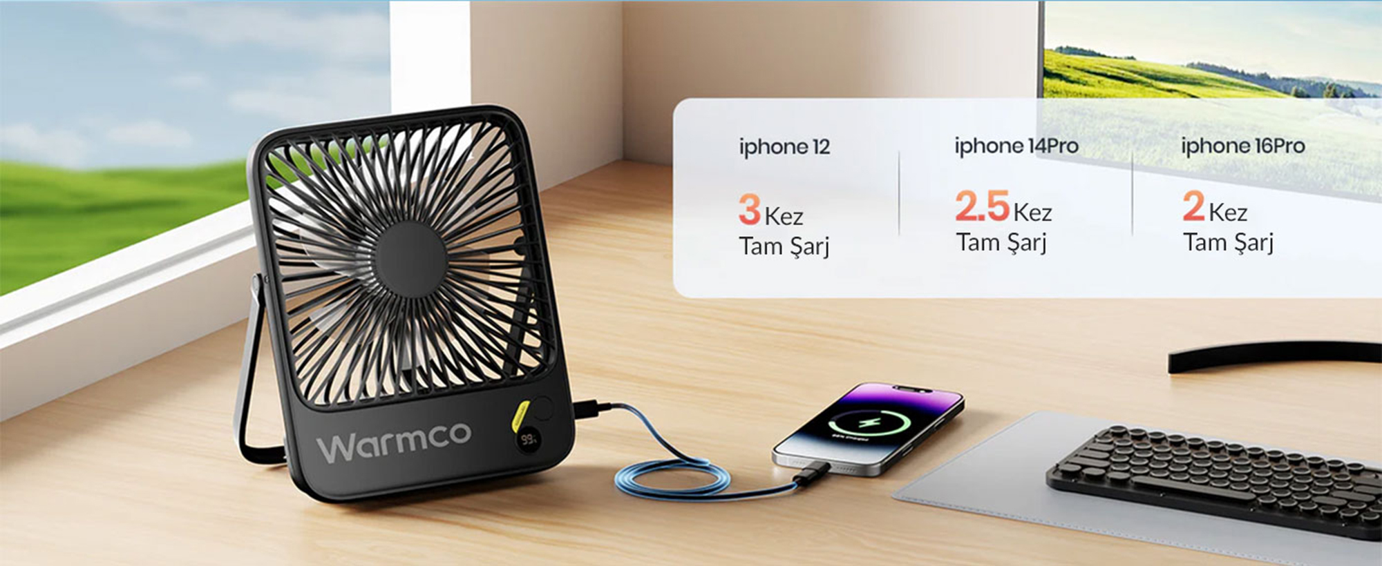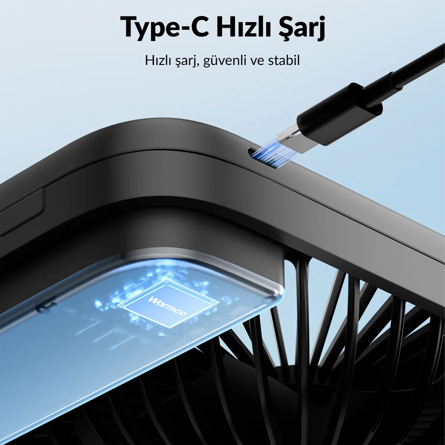 Warmco D3, içerisine entegre edilmiş 10.000 mAh kapasitesindeki dev bataryası sayesinde, düşük rüzgar hızında tam 24 saate kadar (Max 24H) aralıksız serinlik sunar. Kamp yaparken, plajda, karavanda veya elektrik kesintilerinde en güvenilir ve uzun ömürlü serinlik kaynağınızdır. Şarj olması (Charging time) sadece 2-4 saat arası sürer.