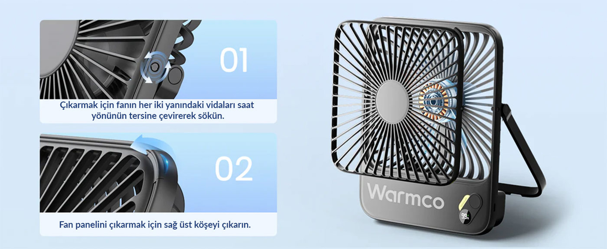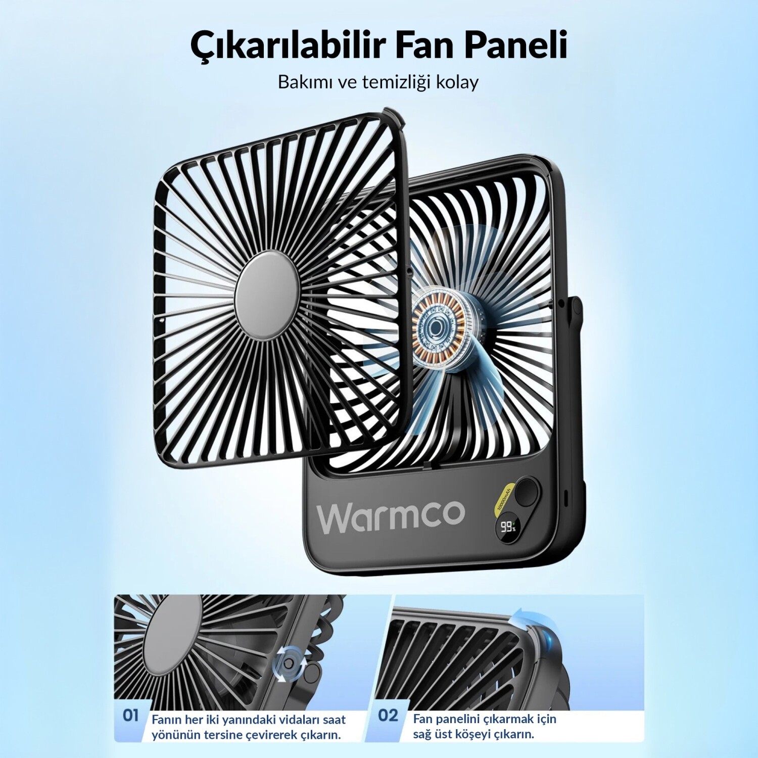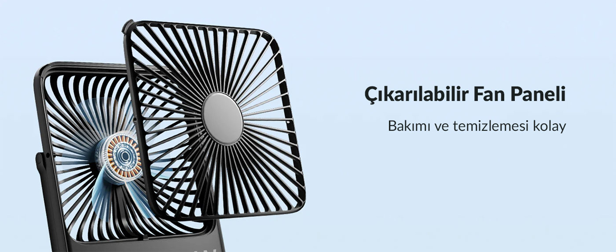 Kutu içeriğine dahil olan mini tornavida (Screwdriver) ile cihazın ön kapağındaki vidayı açarak paneli kolayca yerinden çıkarabilir (Removable Panel), iç pervaneyi temiz bir bezle silerek ilk günkü performansına kavuşturabilirsiniz. Ayrıca "Ultra-thin" (Ekstra İnce) yapısı ve ayarlanabilir (Adjustable Stand) standı ile çantanıza kolayca sığar, masanızda estetik durur.