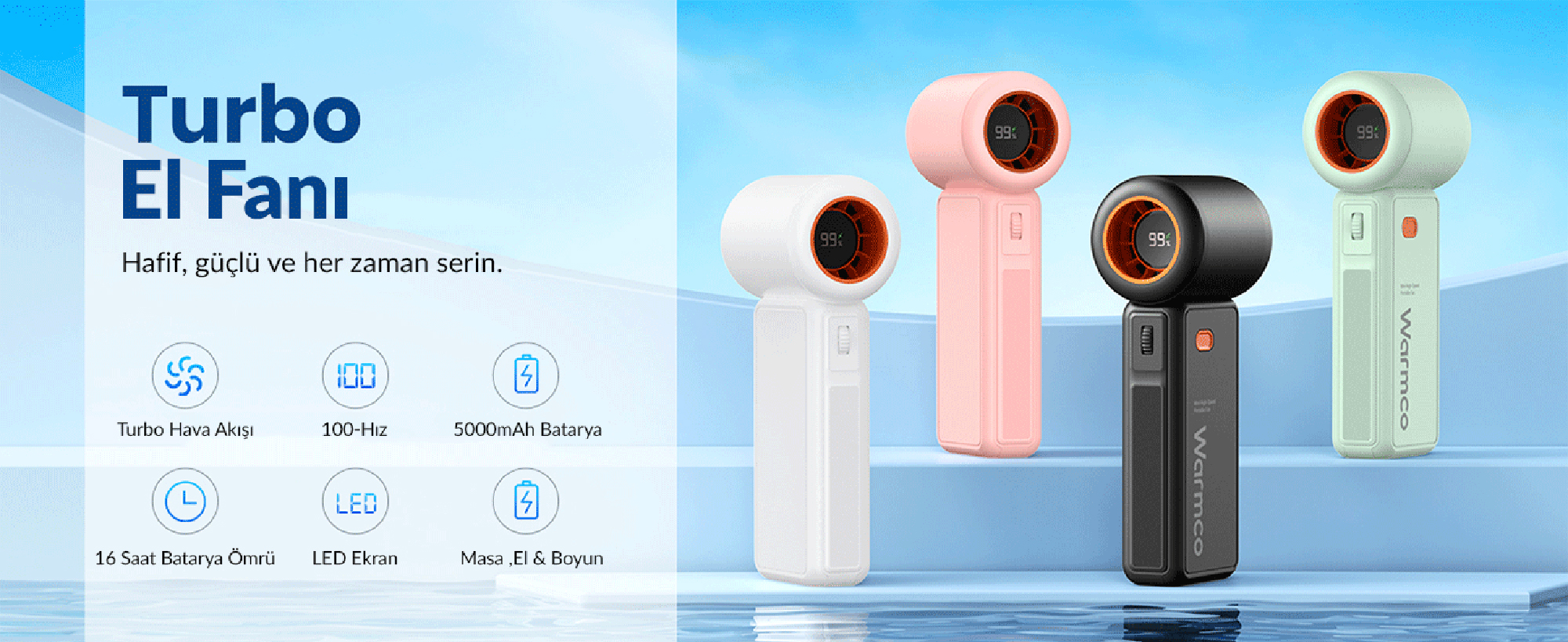 Warmco H1, aerodinamik türbin tasarımı ve 15.000 RPM hıza ulaşabilen fırçasız motoru ile havayı sıkıştırarak yüksek basınçlı ve buz gibi bir hava akımı üretir. Standart fanların yetersiz kaldığı aşırı sıcak günlerde, açık hava etkinliklerinde veya yoğun egzersizler sonrasında vücut ısınızı saniyeler içinde düşürmek için tasarlanmış gerçek bir performans canavarıdır.