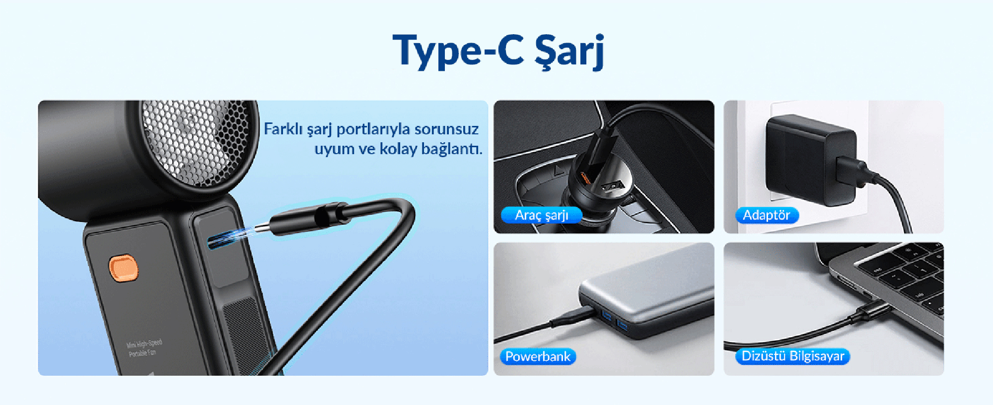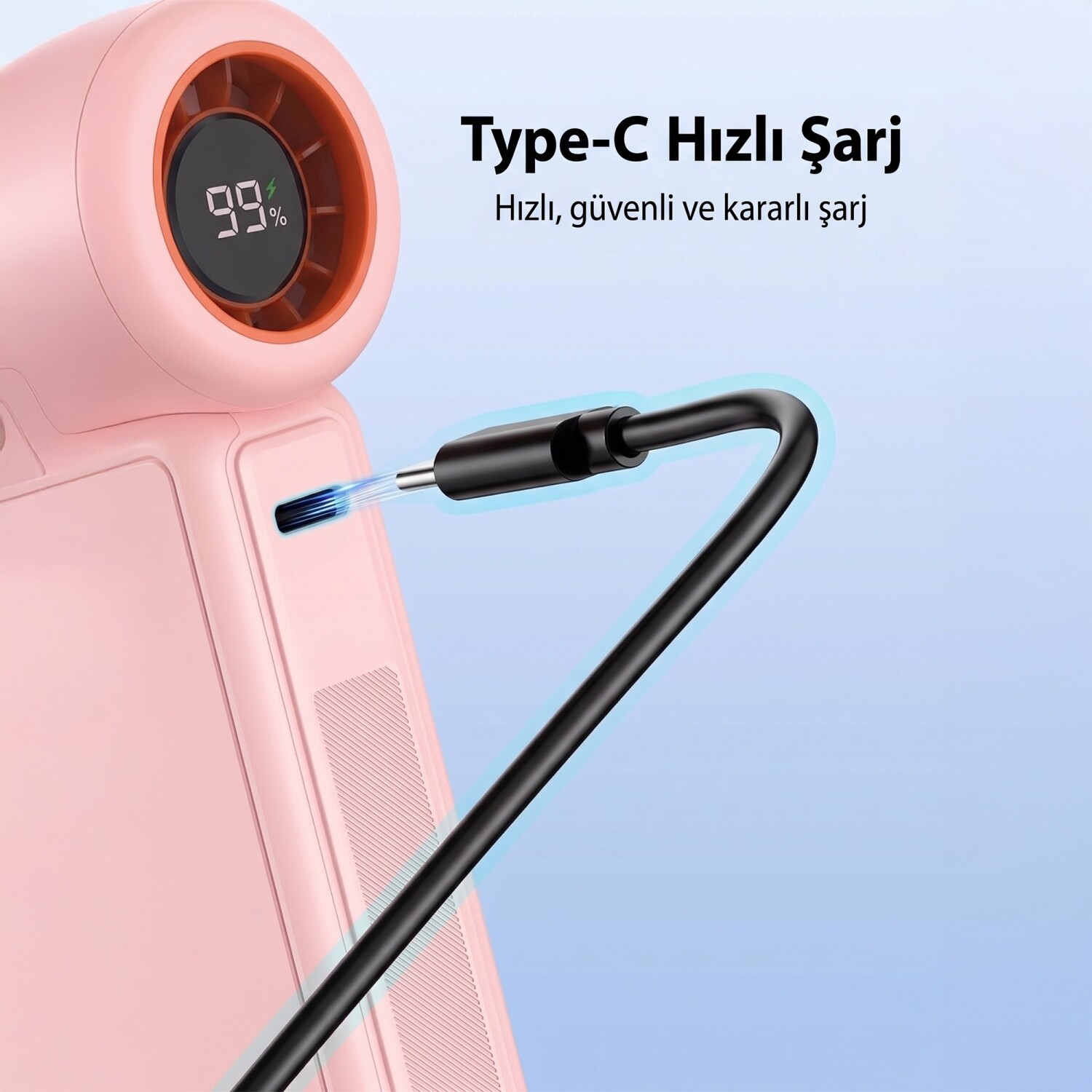 Cihazın hava çıkış bölümünün tam ortasına yerleştirilmiş yenilikçi ve estetik LED dijital gösterge, bataryanın 0 ile 100 arasındaki doluluk oranını net bir şekilde görmenizi sağlar. Şarjınız azaldığında (ekran karardığında), güncel standart olan Type-C portu üzerinden (5V/2A giriş desteği ile) telefon adaptörünüz veya taşınabilir güç kaynağınız (Powerbank) ile hızla şarj edebilirsiniz.
