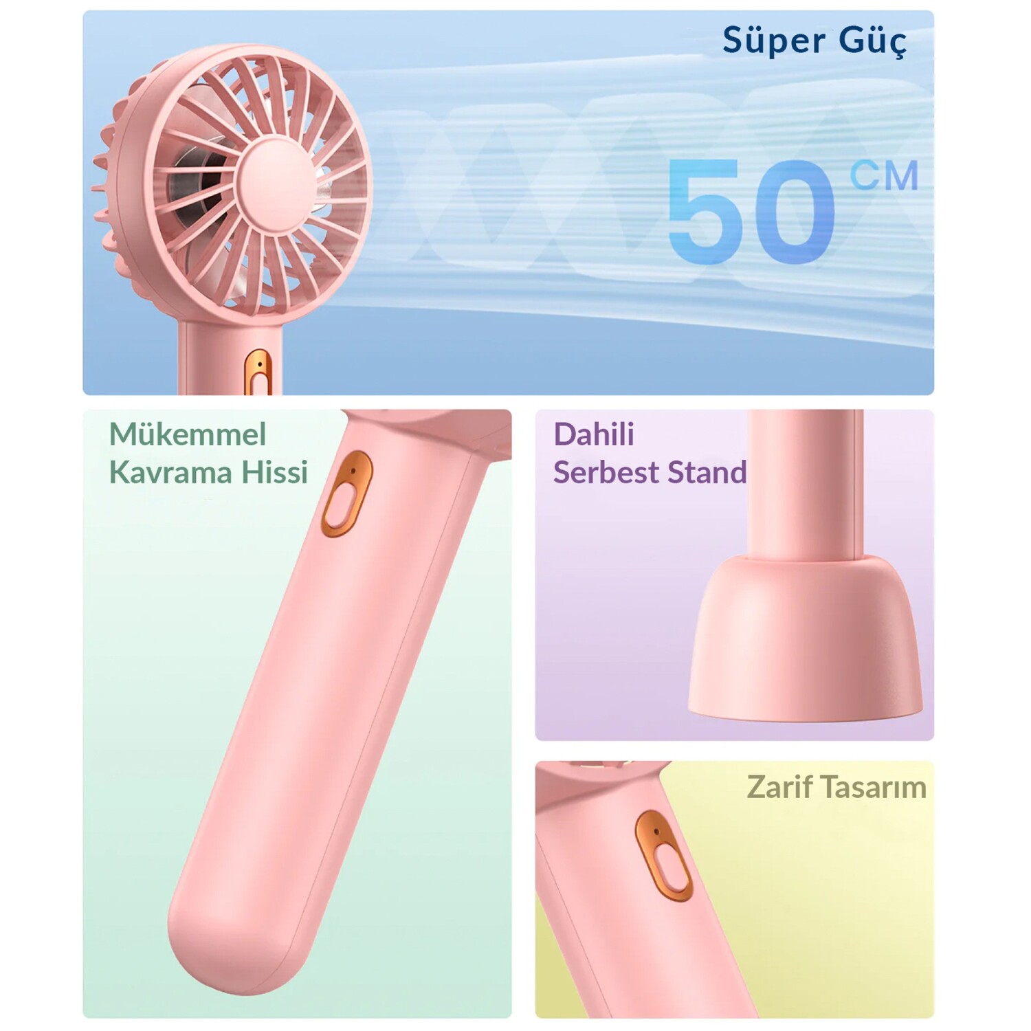 Warmco K30 Taşınabilir Mini Şarjlı El Vantilatörü, ultra kompakt boyutuyla çantanıza, cebinize veya avucunuzun içine mükemmel bir şekilde sığacak biçimde tasarlandı. Zarif pembe rengi ve yumuşak hatlara sahip ergonomik yapısıyla dikkat çeken bu mini fan, küçük boyutuna rağmen içinde barındırdığı 5W gücündeki motoru ve 3 farklı hız ayarı ile size dilediğiniz an güçlü bir serinlik sunar. 1800mAh kapasiteli güçlü bataryası ile sık sık şarj etme derdine son verirken, yeni nesil USB Type-C bağlantı portu ile her yerde ve her cihazla kolayca şarj edilebilir. İster yaz tatilinde sahilde, ister kalabalık toplu taşımalarda, isterseniz de ofis masanızda olun; sıcak basan her an anında imdadınıza yetişecek en şık ve hafif kurtarıcınız olacak.