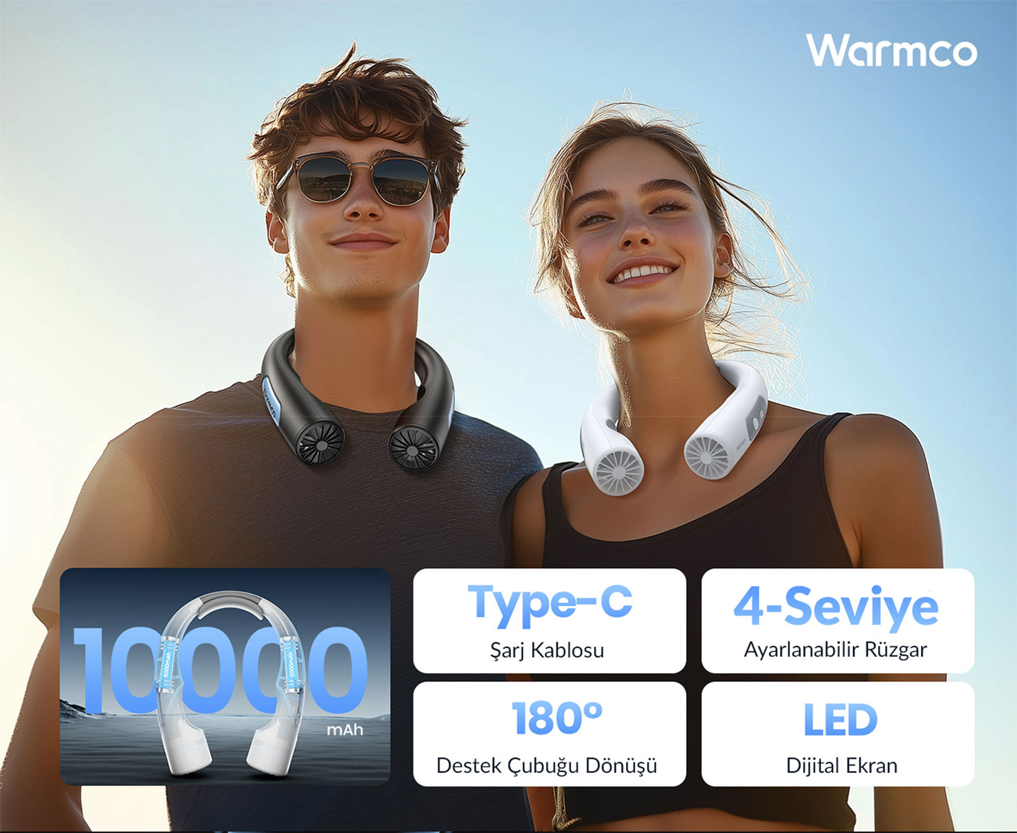 1 x Warmco N1 Boyun Vantilatörü 10000mAh Şarjlı Dijital Göstergeli 4 Kademeli Taşınabilir Soğutucu Fan